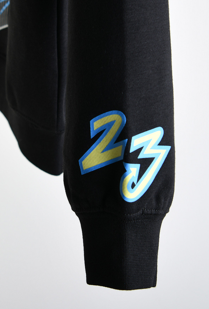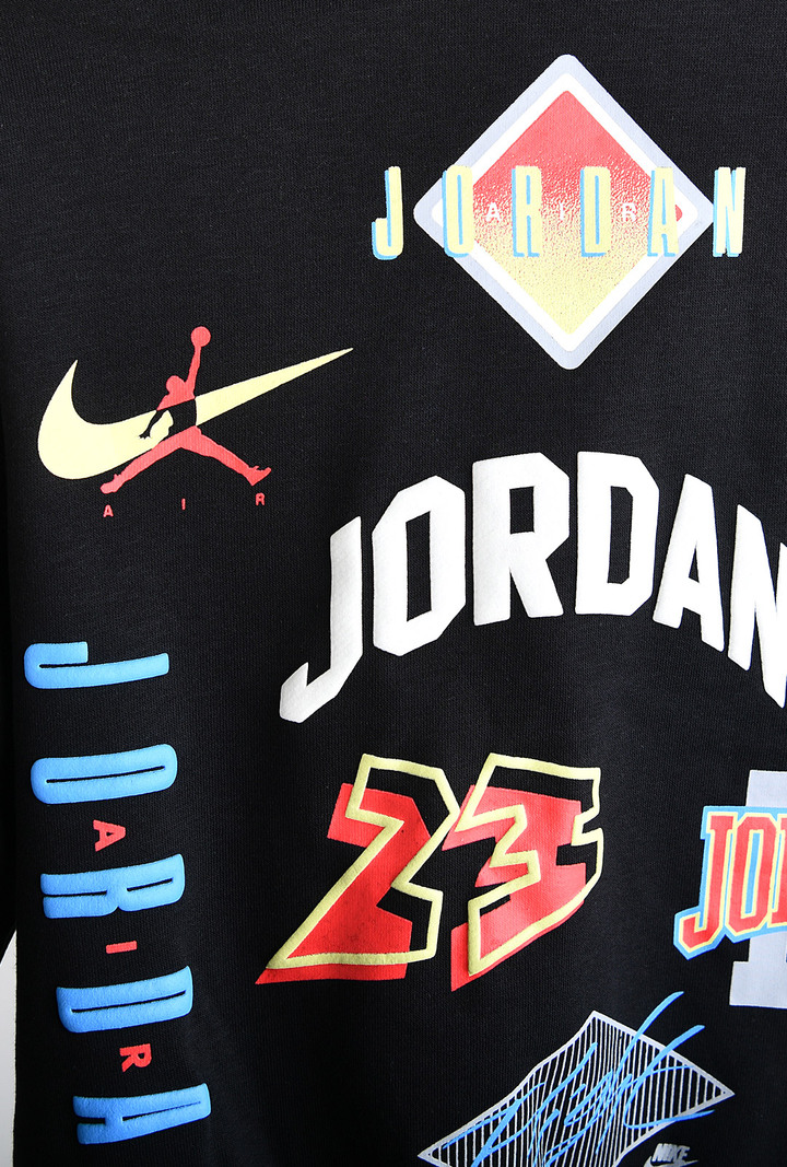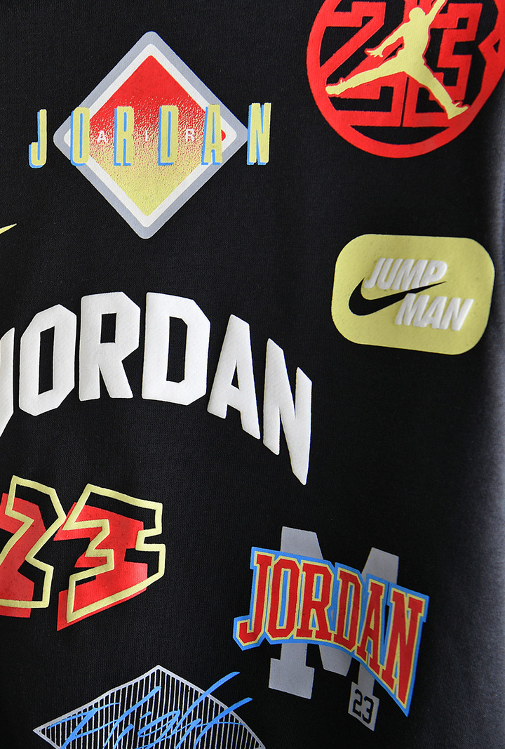 A. 앞면은 레터링 로고로 깔끔한 편, 뒷면은 다양한 조던 로고 그래픽으로 포인트가 강한 구성