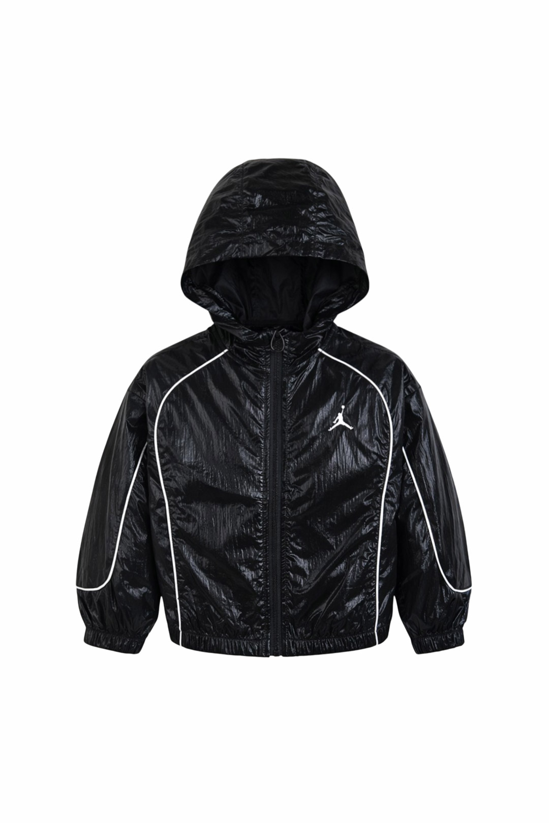 심플한 블랙 바탕 위에 파이핑 라인이 더해져 실루엣이 선명하게 드러나는 윈드러너 스몰 점프맨 로고가 절제된 브랜드 포인트를 남겨 전체 디자인이 깔끔하게 정리됨 광택이 감도는 표면 덕분에 기본 자켓보다 존재감이 더 또렷하게 느껴짐 가볍고 경쾌한 아우터를 찾을 때 잘 어울리는 스타일