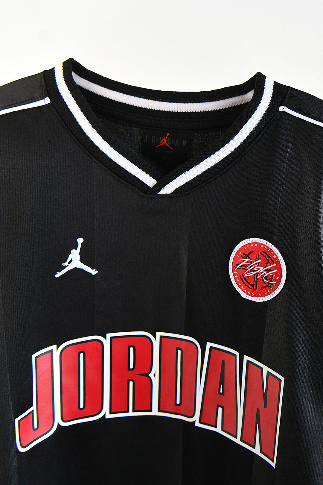 Q 어떤 스타일이 강하게 느껴지나요 A 브이넥 저지 특유의 블록코어 무드가 돋보임 Q 디자인 포인트는 무엇인가요 A 배색 넥 라인 전면 로고 패치 디테일이 눈에 띔 Q 단독으로 입어도 충분한가요 A 유니폼 감성이 살아 있어 한 장만으로도 포인트가 됨 Q 어떤 하의와 잘 어울리나요 A 트랙 팬츠 쇼츠 와이드 팬츠와 매치하기 좋음 Q 여름에도 입기 괜찮나요 A 가벼운 폴리 소재라 비교적 쾌적하게 입기 좋음