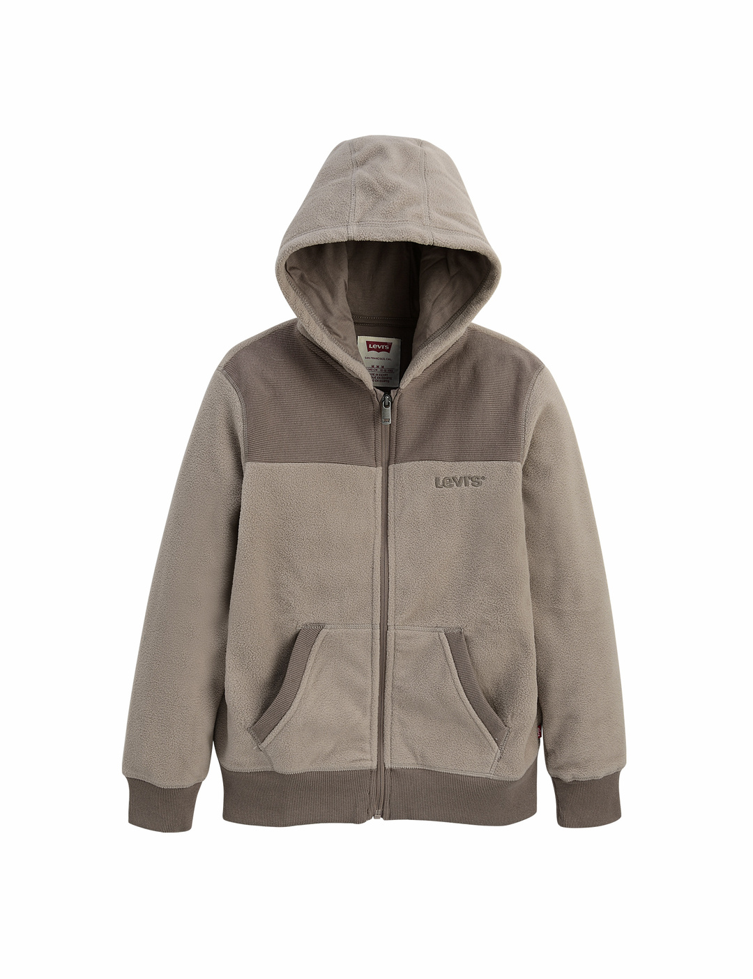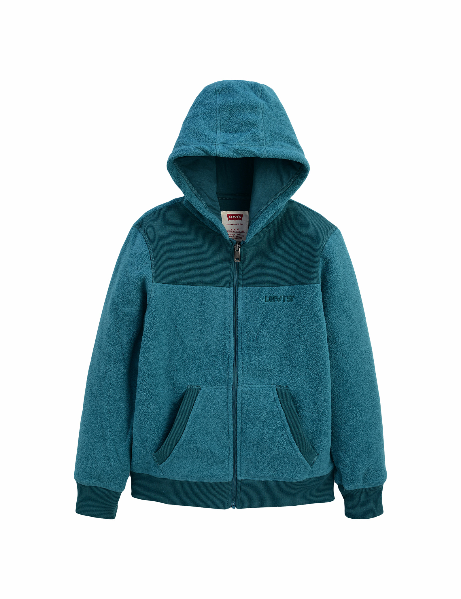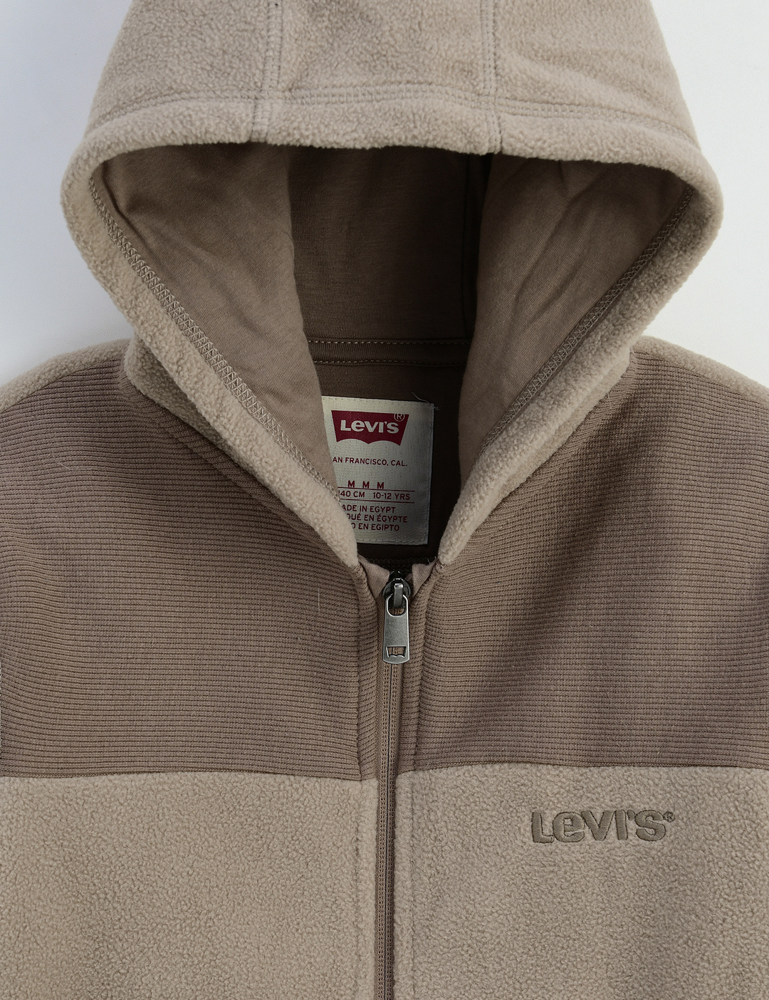 부드럽고 보온성 높은 플리스 소재에 어깨 부분에 텍스쳐가 있는 풀집 후디