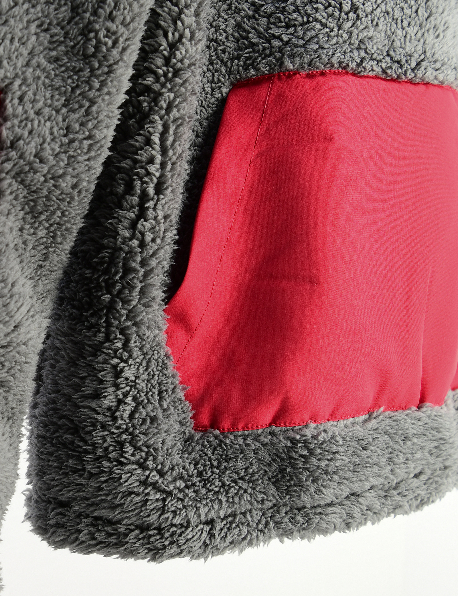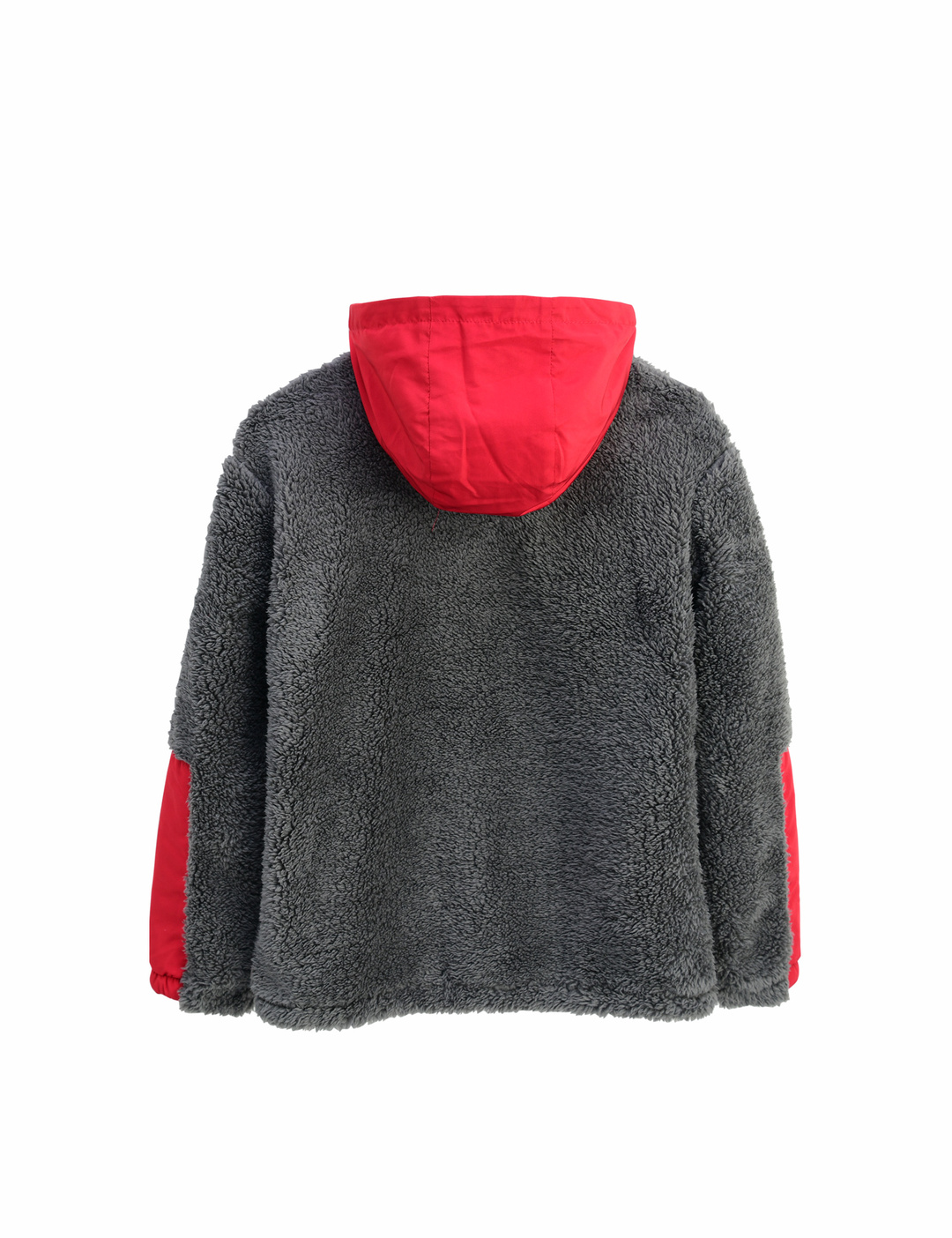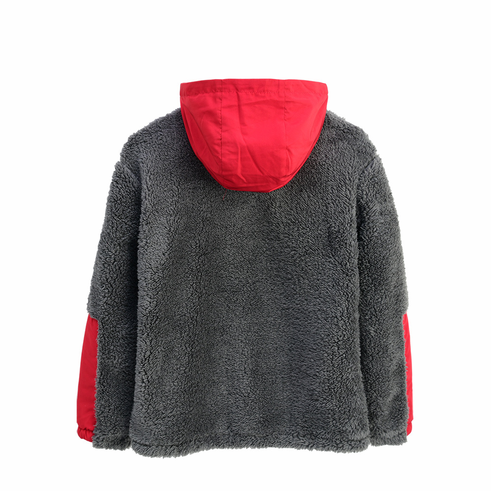 셰르파 소재의 몸판에 소매와 앞주머니가 나일론으로 되어 있는 반집스타일의 후디