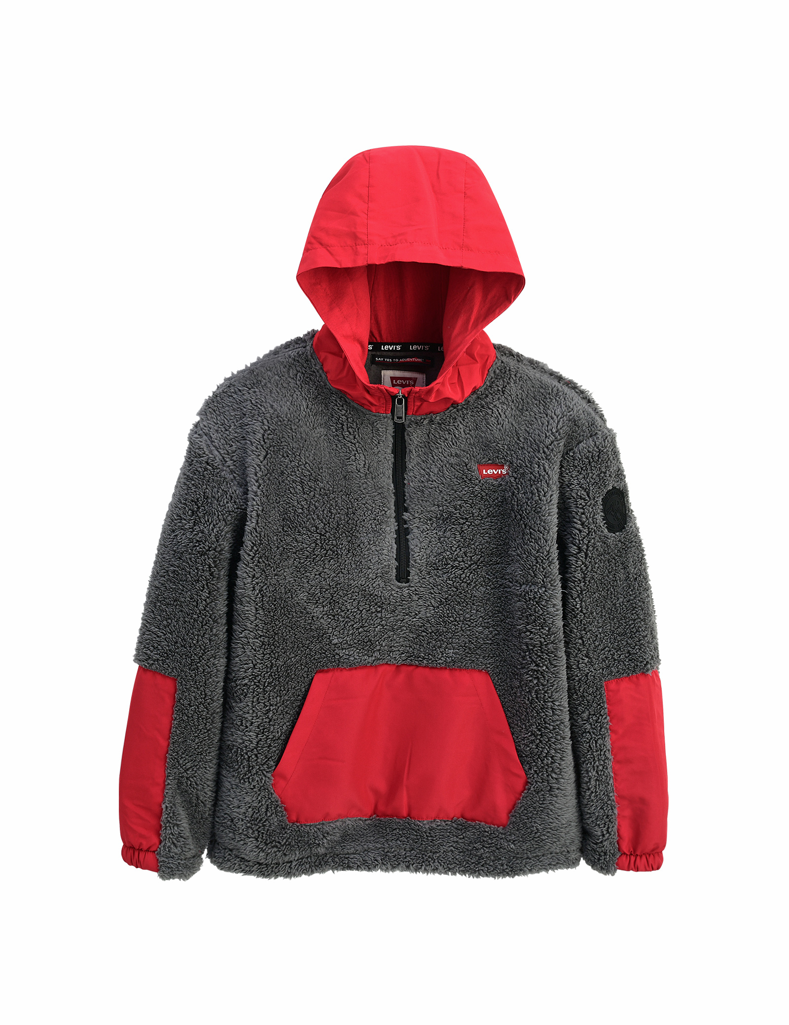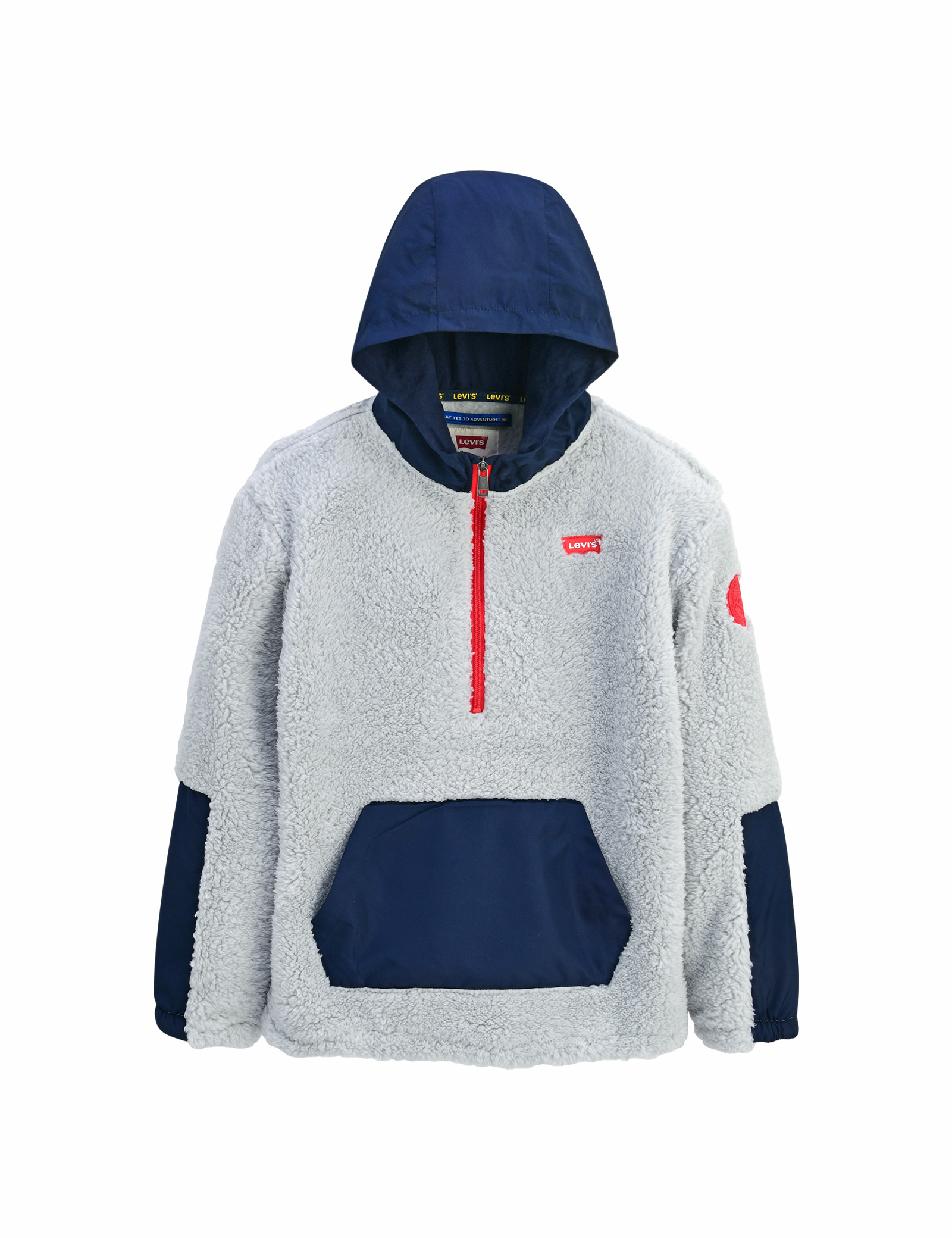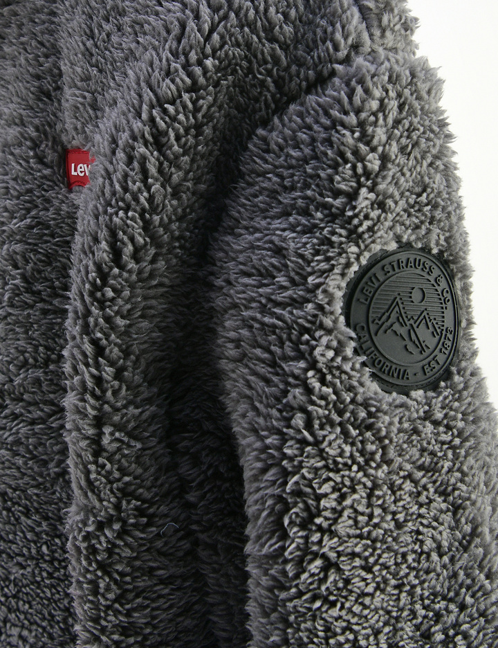 셰르파 소재의 몸판에 소매와 앞주머니가 나일론으로 되어 있는 반집스타일의 후디