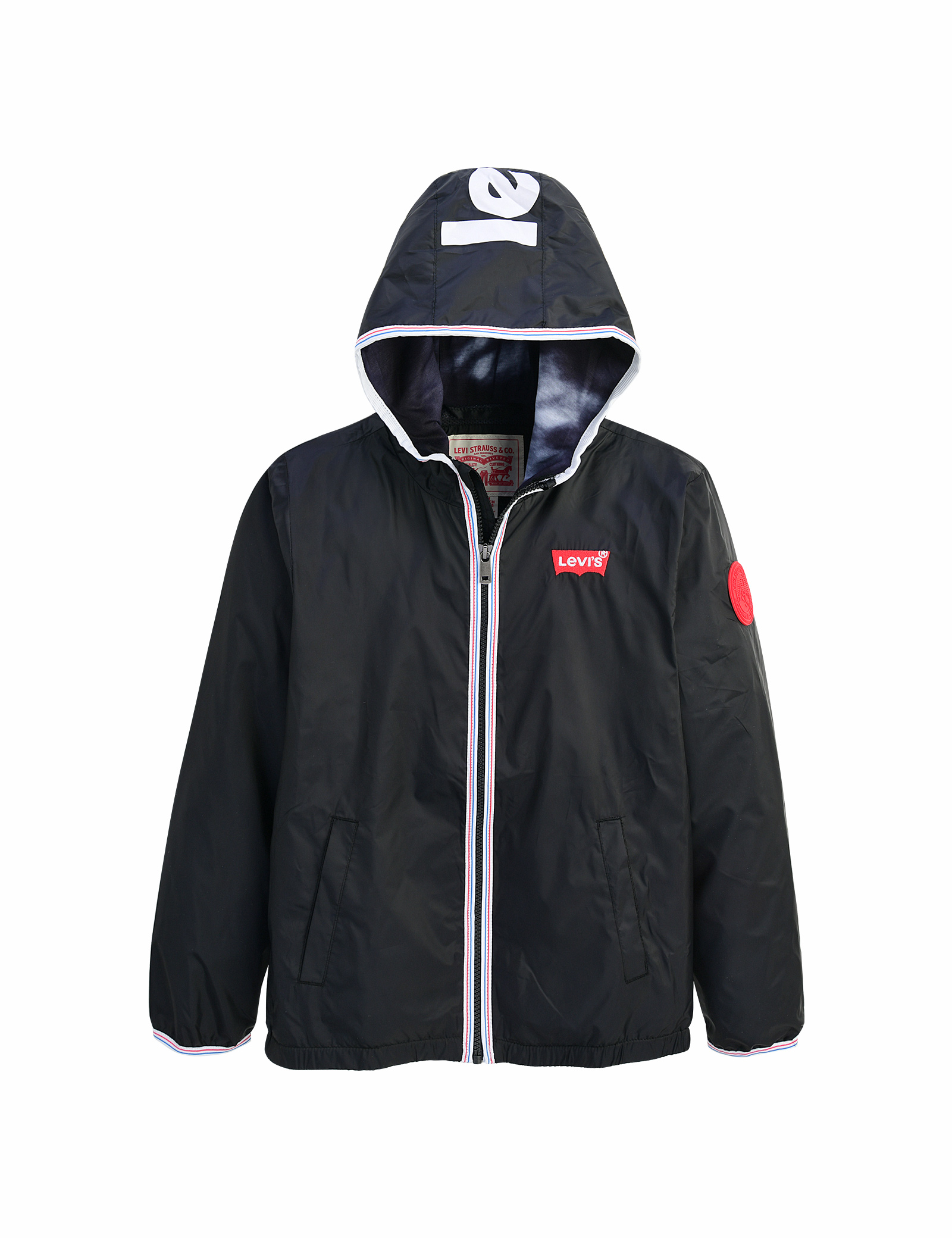앞지퍼와 후드의 테이핑과 가슴의배트윙 패치, 소매의 로고 패치가포인트이며, 올오버 프린트의 면안감이 있는 윈드자켓