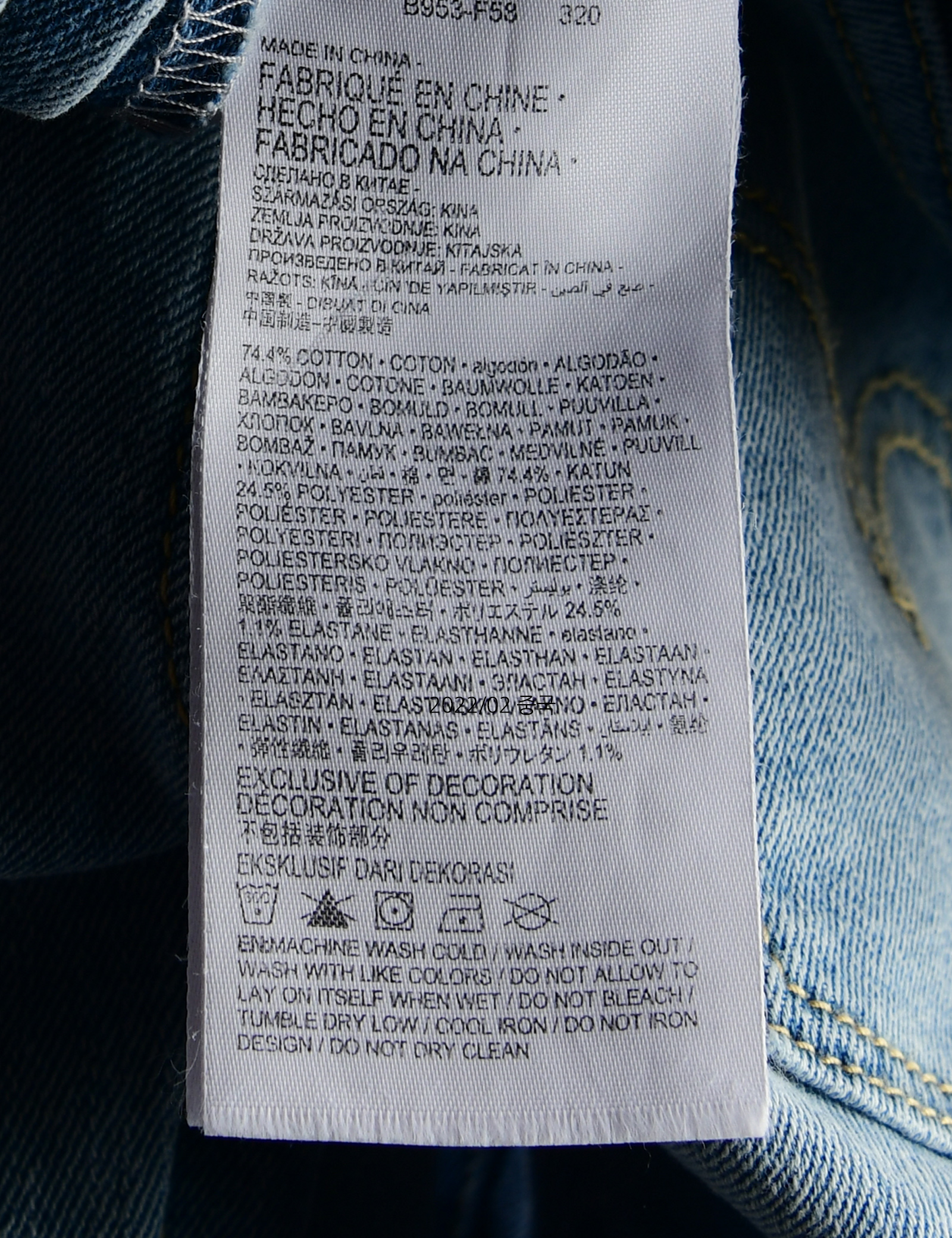 제품소재 (겉감)면74.4%,폴리에스터24.5%,폴리우레탄1.1%