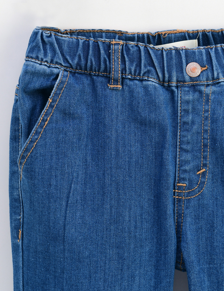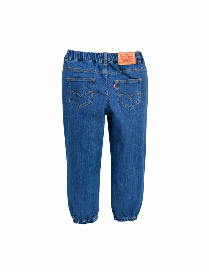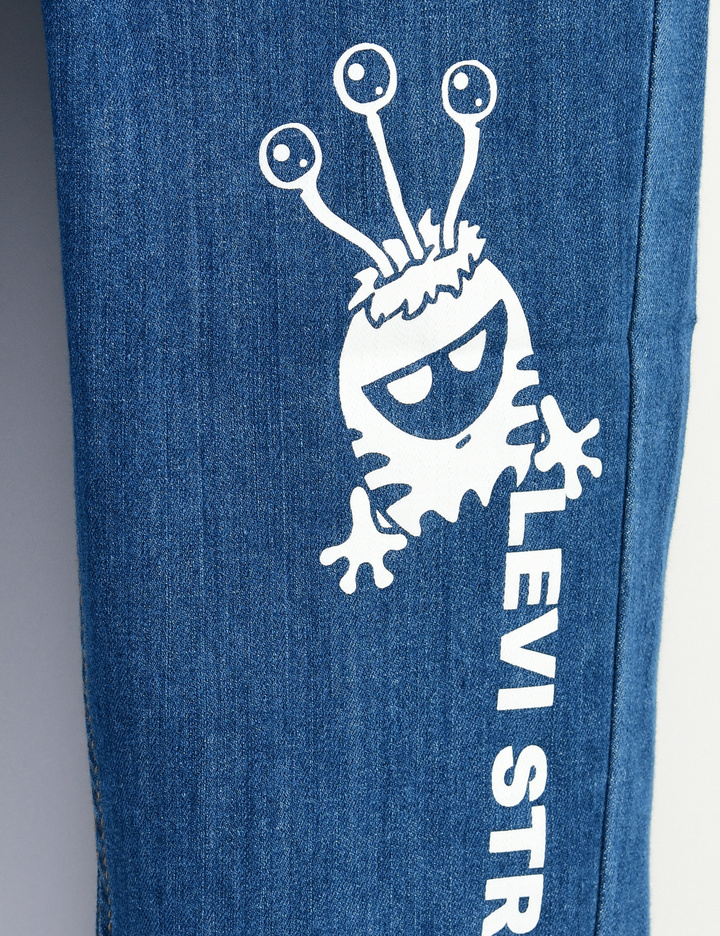 허리가 밴딩으로 되어 있고, 리틀몬스터 캐릭터가 앞판에 프린트 된데님 조거 팬츠