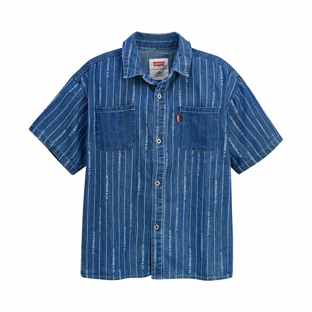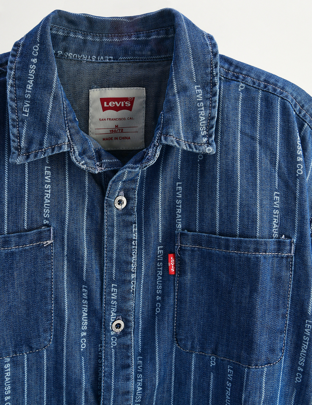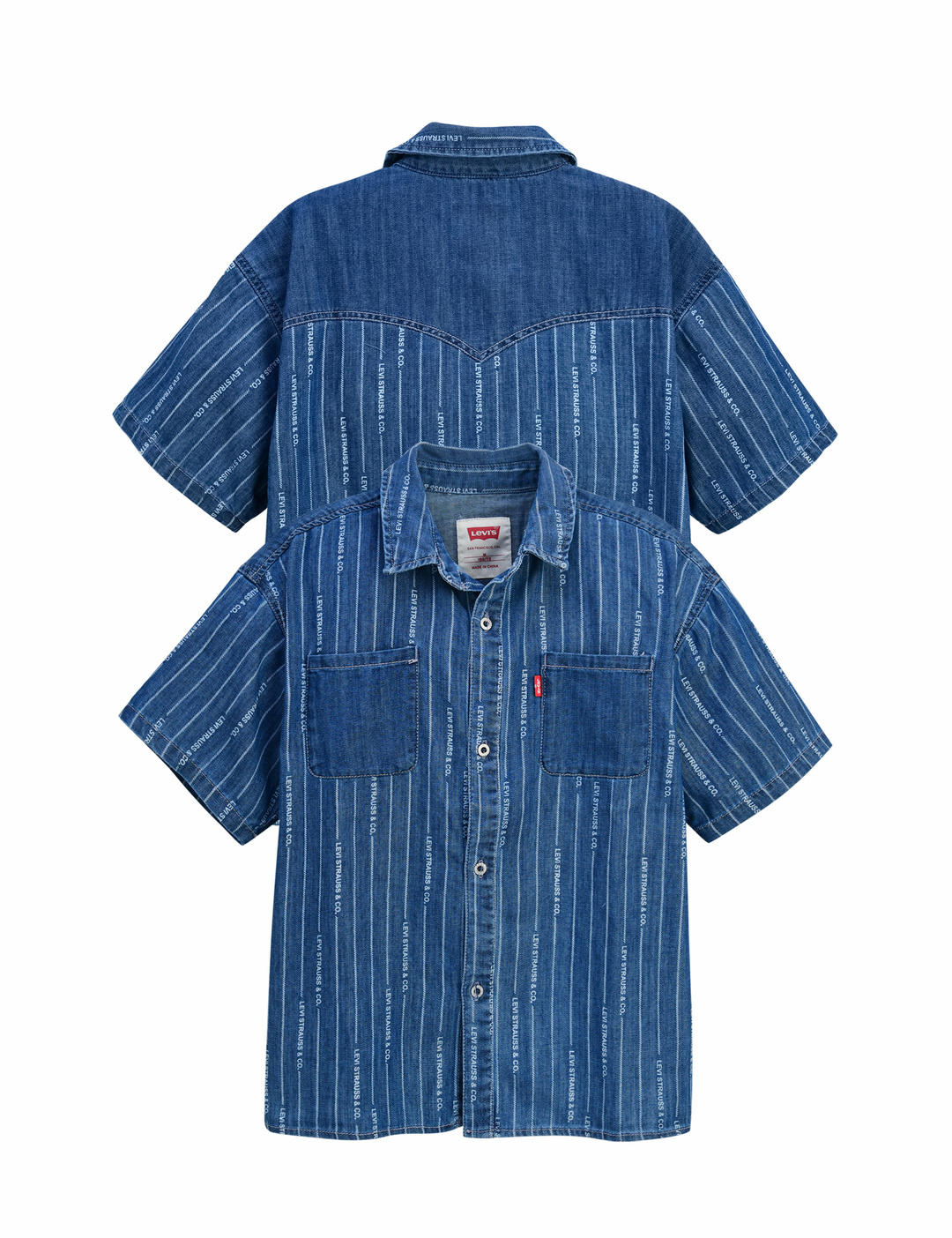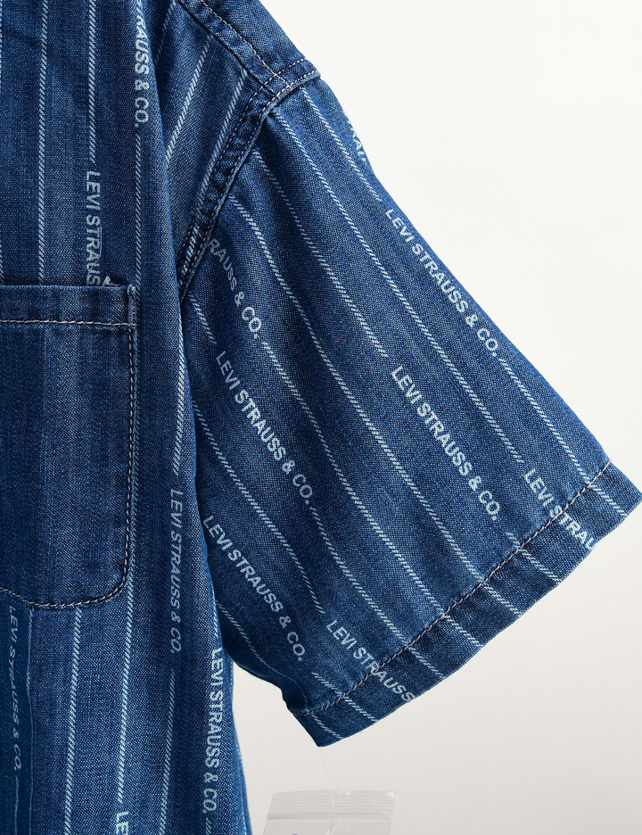 로고가 들어간 스트라이프 패턴에앞 포켓과 어깨 요크 디테일의 가볍고 시원한 데님소재 셔츠