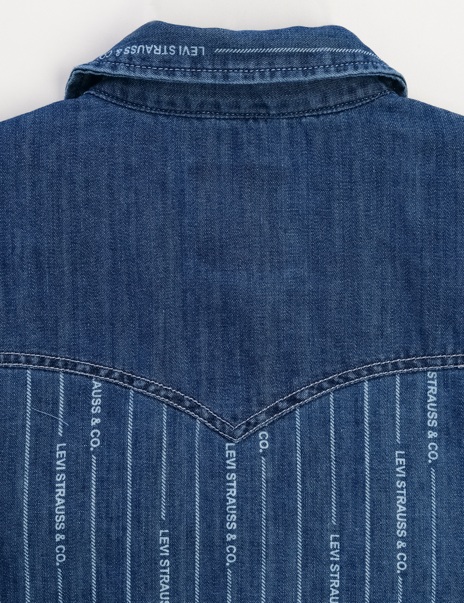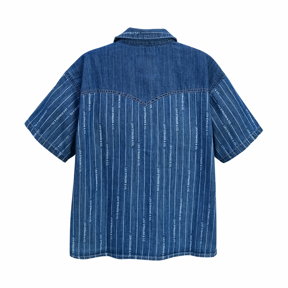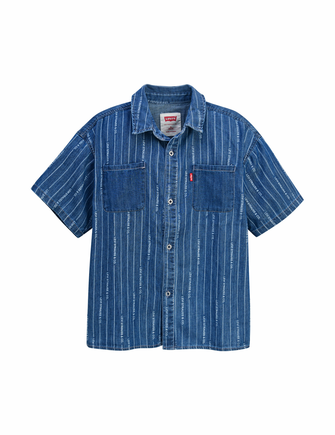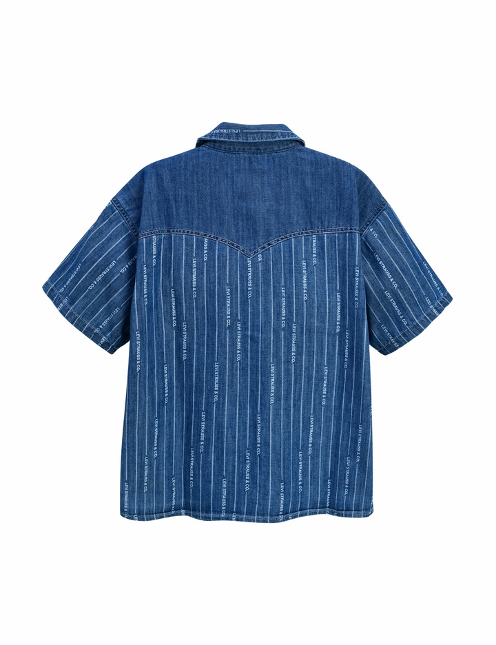 로고가 들어간 스트라이프 패턴에앞 포켓과 어깨 요크 디테일의 가볍고 시원한 데님소재 셔츠