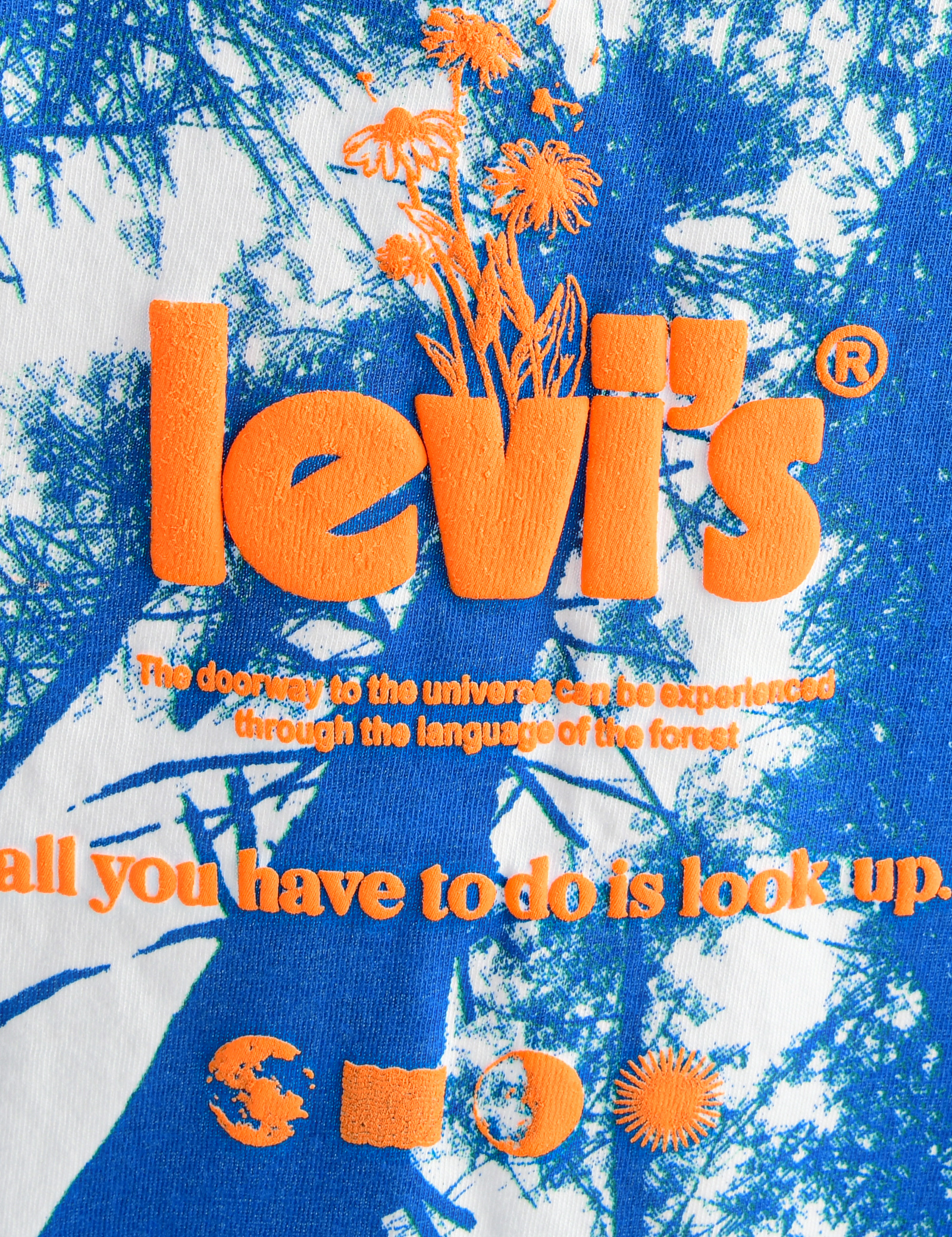 숲 그래픽 위에 로고가 입체감 있는 퍼프잉크로 들어가 있는 오가닉코튼 반팔티셔츠