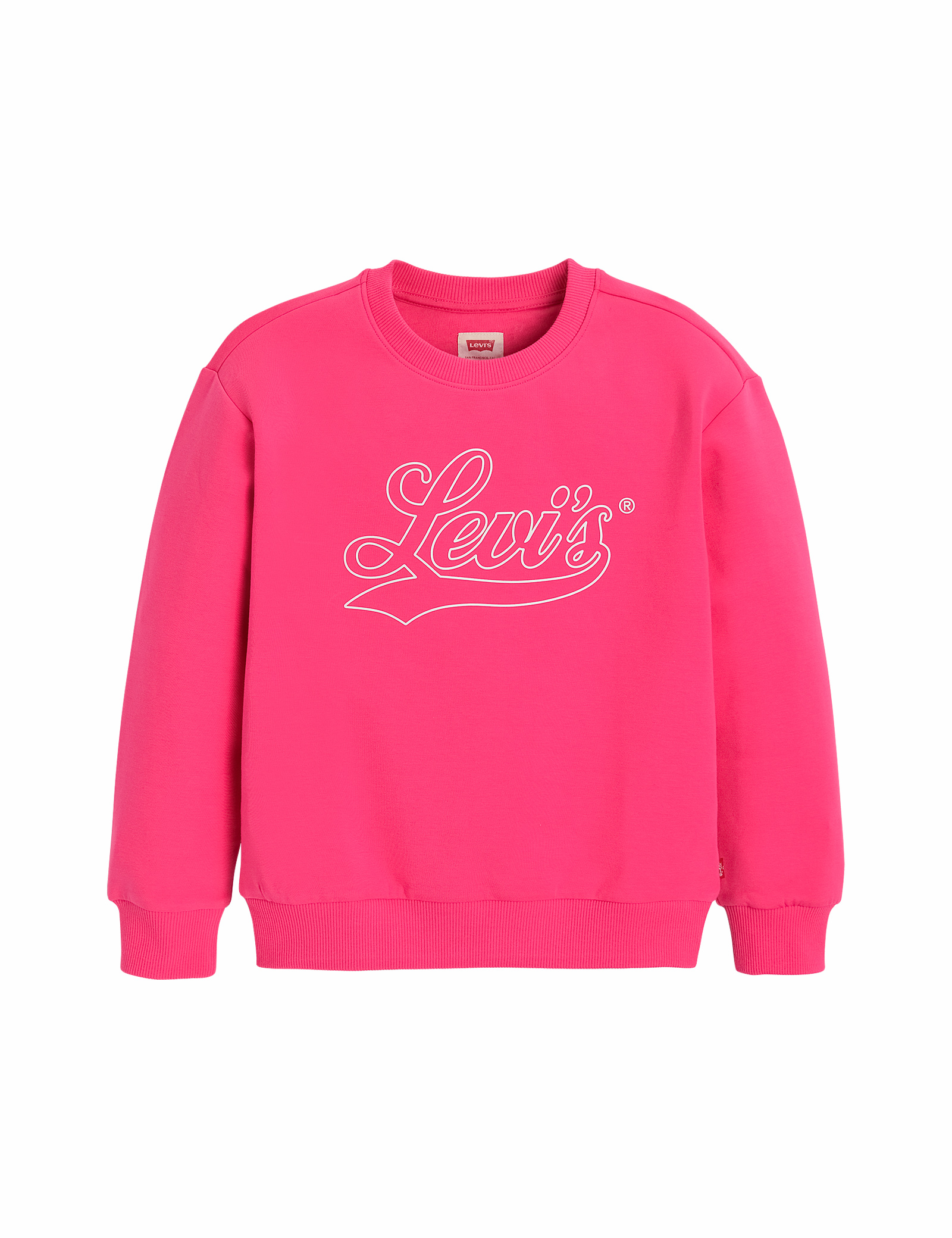 앞판에 리바이스 필기체 로고가포인트로 들어가 있으며, 내구성과신축성이 좋은 더블니트 소재를사용한 여아 크루넥 풀오버