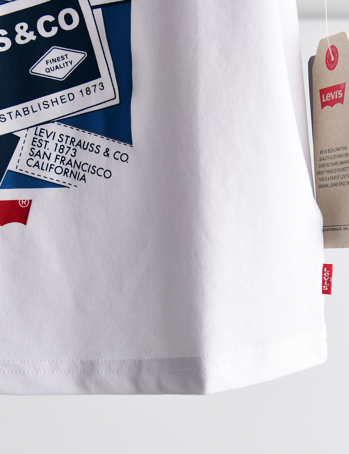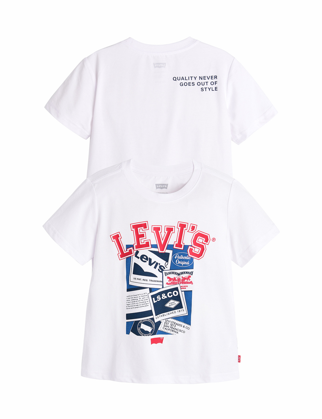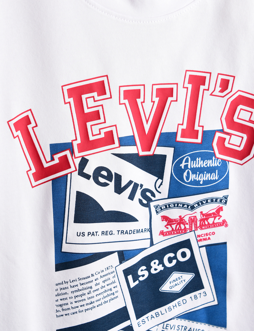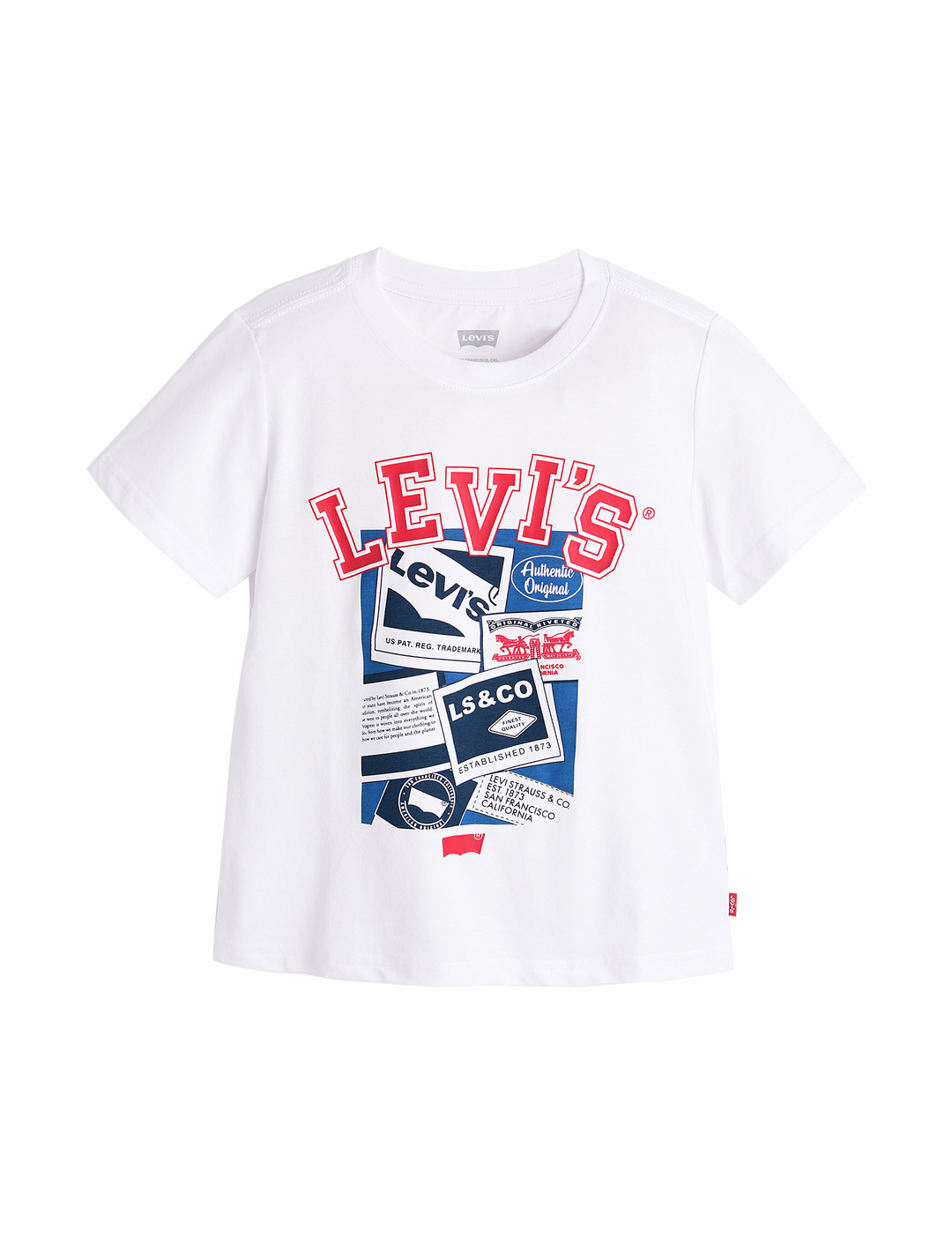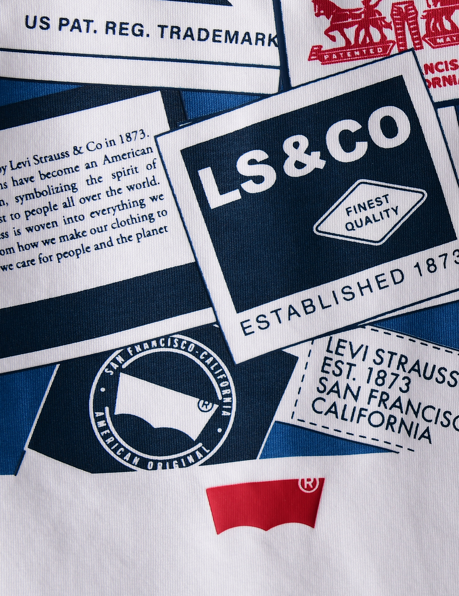 전면에 다양한 라벨이 겹쳐져 있는 그래픽이 포인트인 루즈핏의쿨소재 반팔 티셔츠