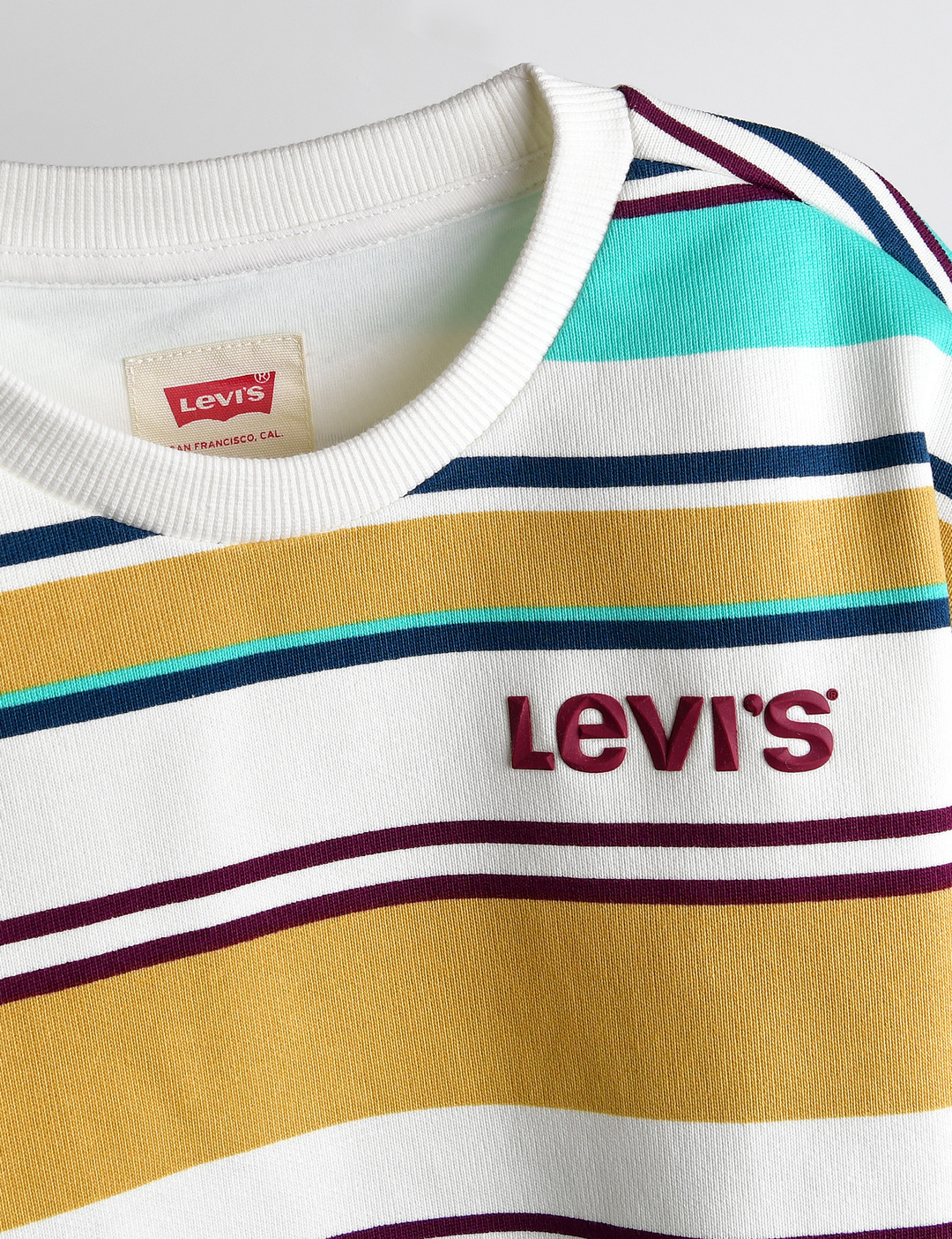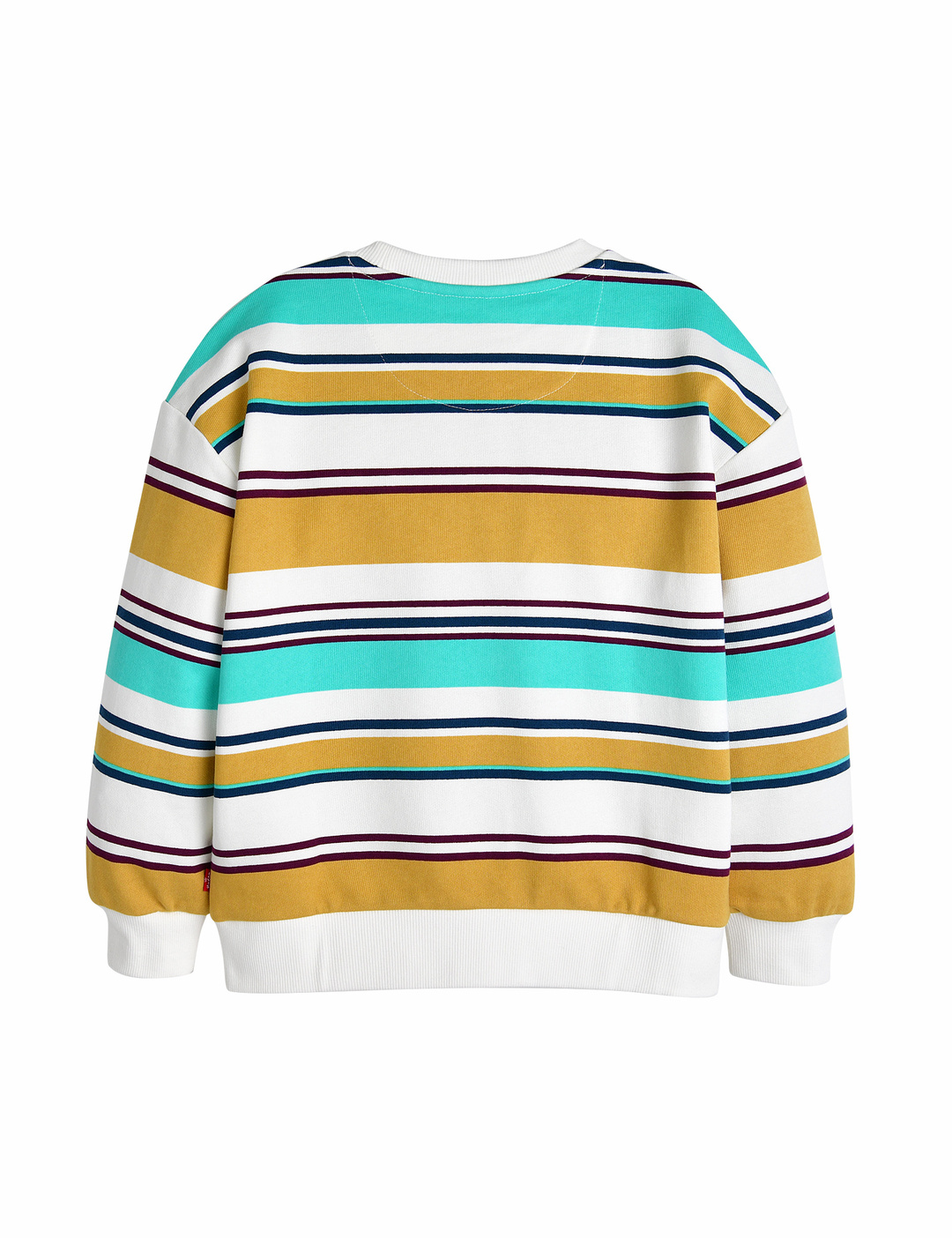 다양한 컬러의 스트라이프 패턴이전체적으로 들어가 있으며, 가슴 부분에 자수 로고로 포인트를 준 풀오버