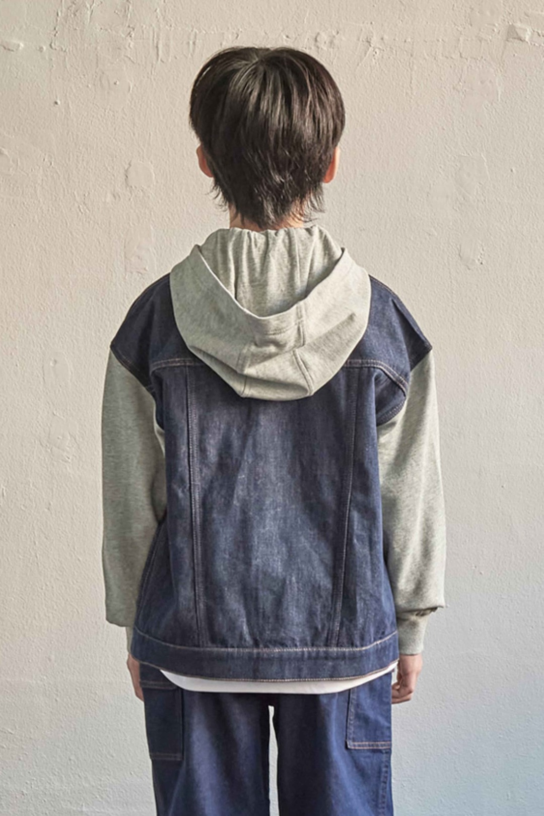 클래식 트러커 재킷 구조를 기반으로 한 디자인 소매 니트 배색으로 활동성과 편안함을 더한 구조 후드 디테일로 캐주얼한 스타일 연출 데님 특유의 빈티지 무드를 살린 아우터