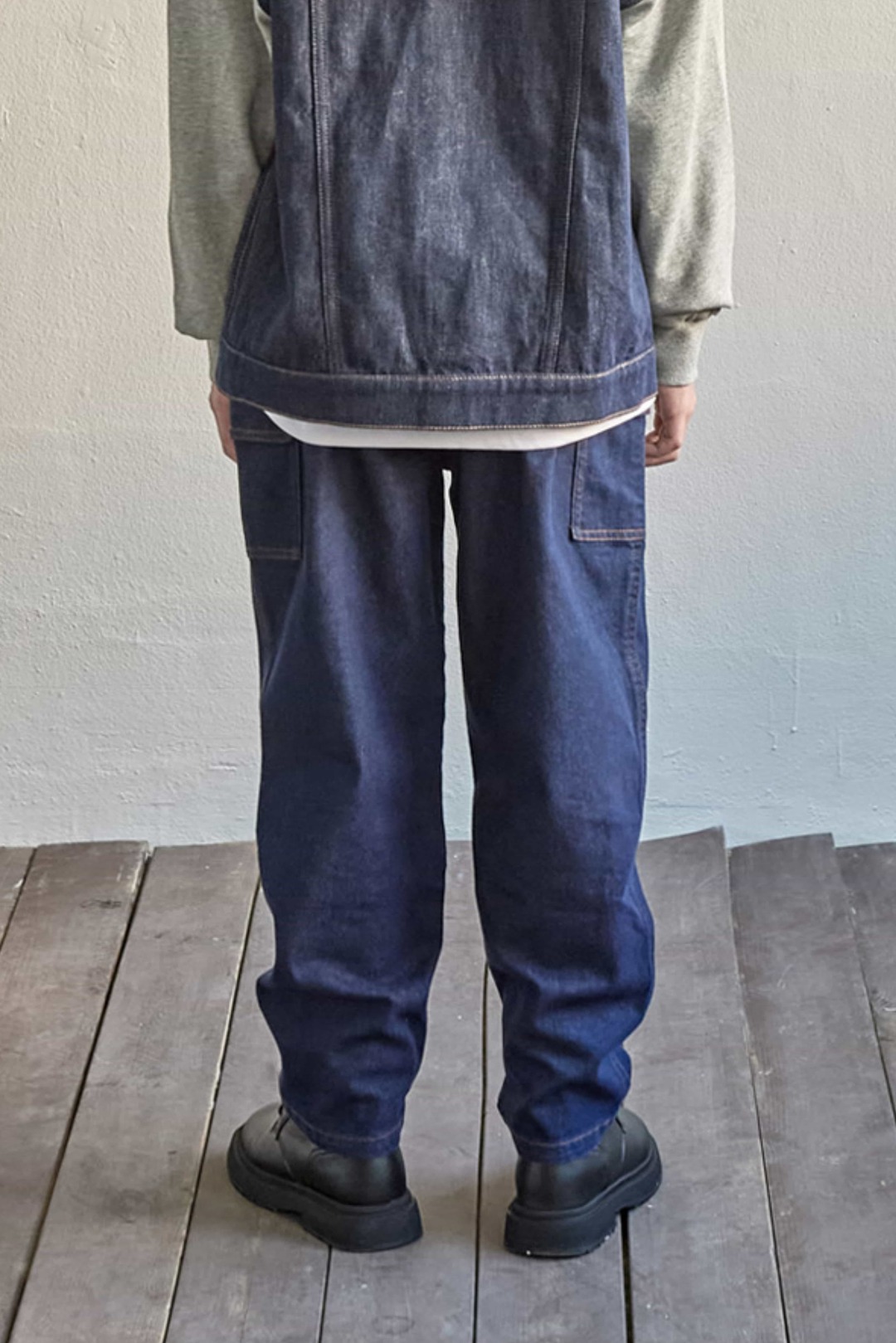 허벅지부터 여유 있게 떨어지며 다리 라인이 편안한 배기 대드 핏