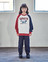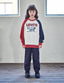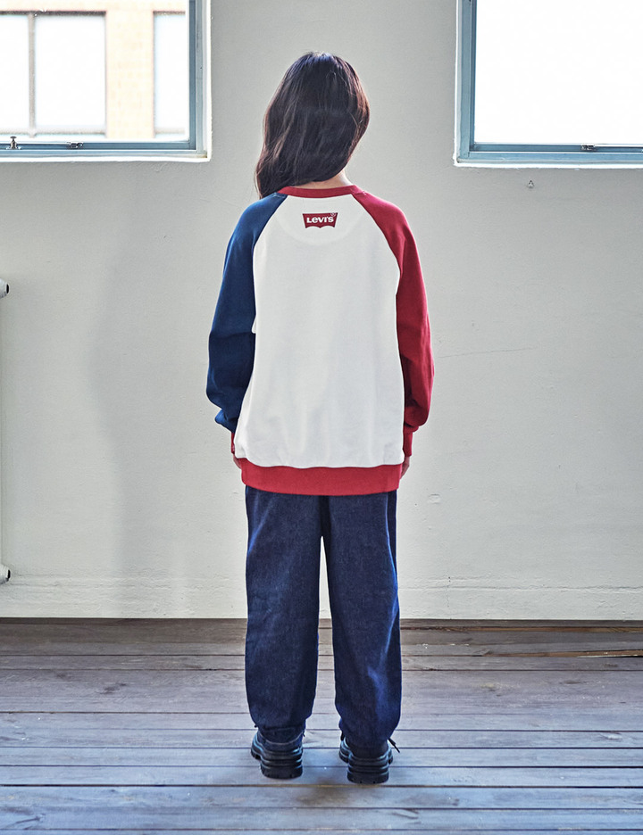 A. 배색 라글란 디자인과 전면 로고 그래픽에 데님 텍스처 감성을 더해 캐주얼 포인트가 됩니다
