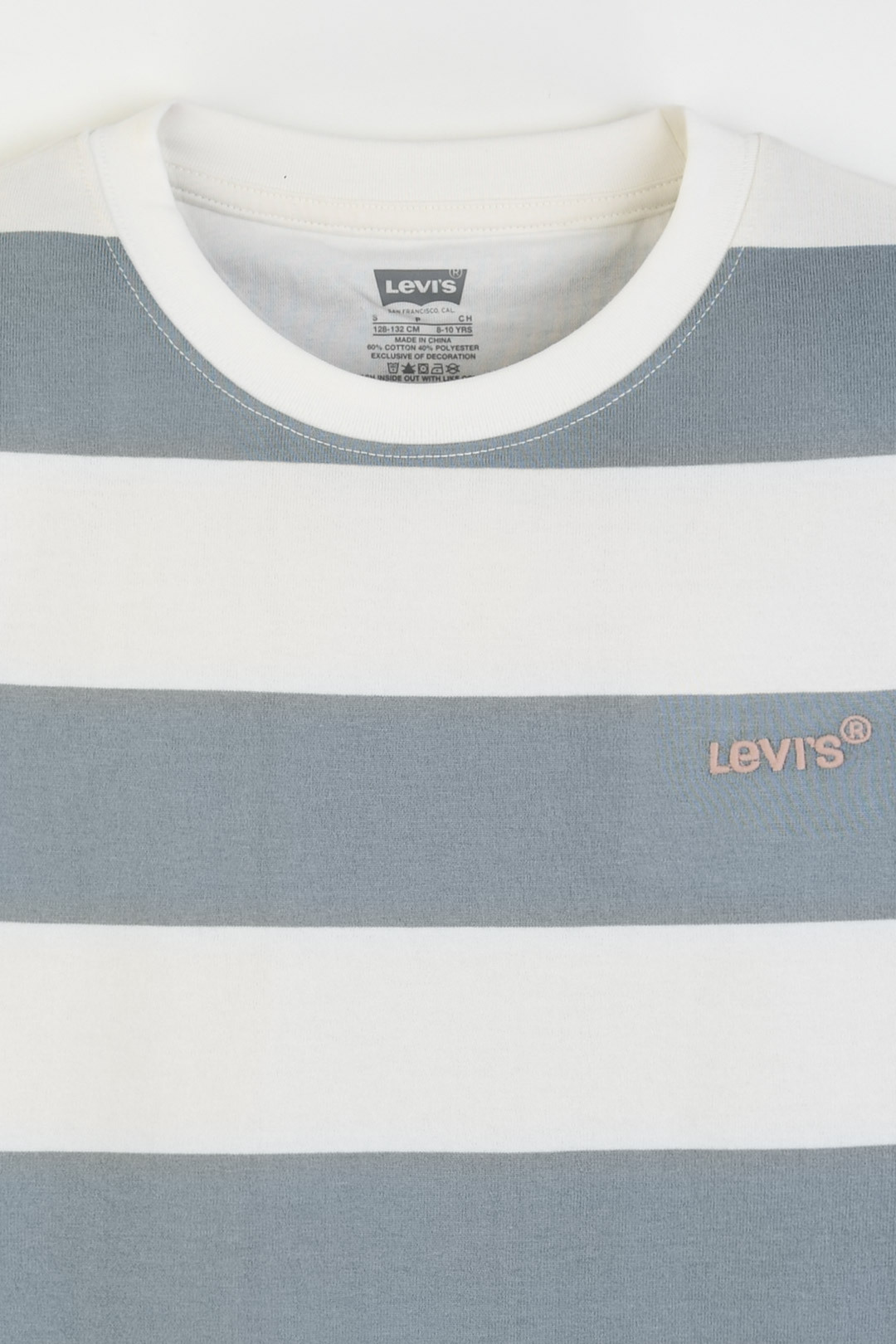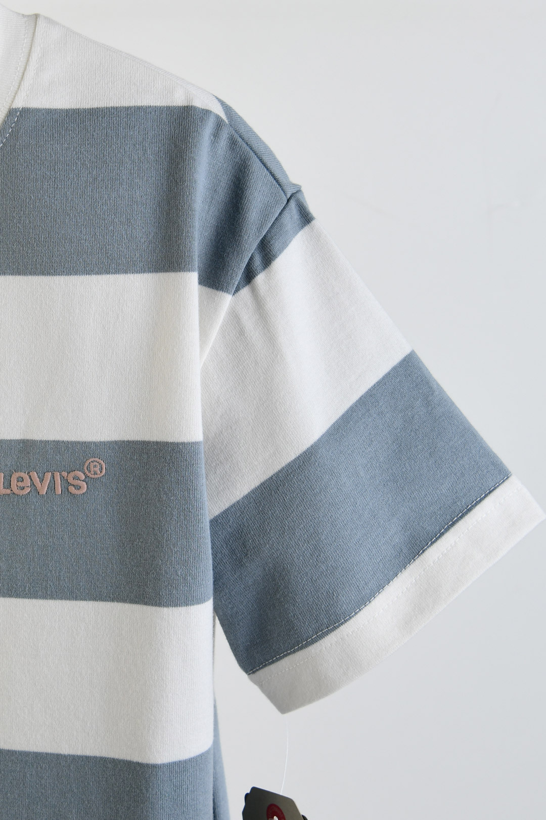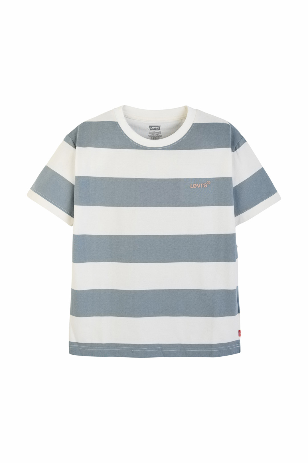 와이드한 스트라이프 패턴이 시선을 끄는 주니어 반팔티 드롭 숄더 디테일이 자연스럽고 편안한 분위기를 더해줌 몸판에 여유가 있어 단독 착용은 물론 레이어드에도 활용 가능 데님과 쇼츠 어디에나 잘 어울려 스타일링 폭이 넓은 아이템