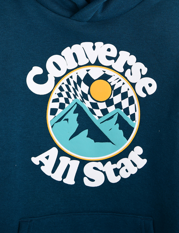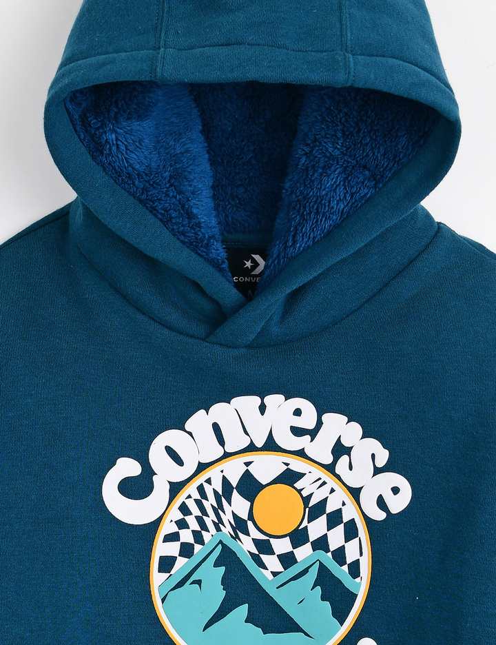 •플리스 소재의 후드•중앙의 빅 그래픽과 레터링, 캥거루 포켓으로 포인트를 준 제품