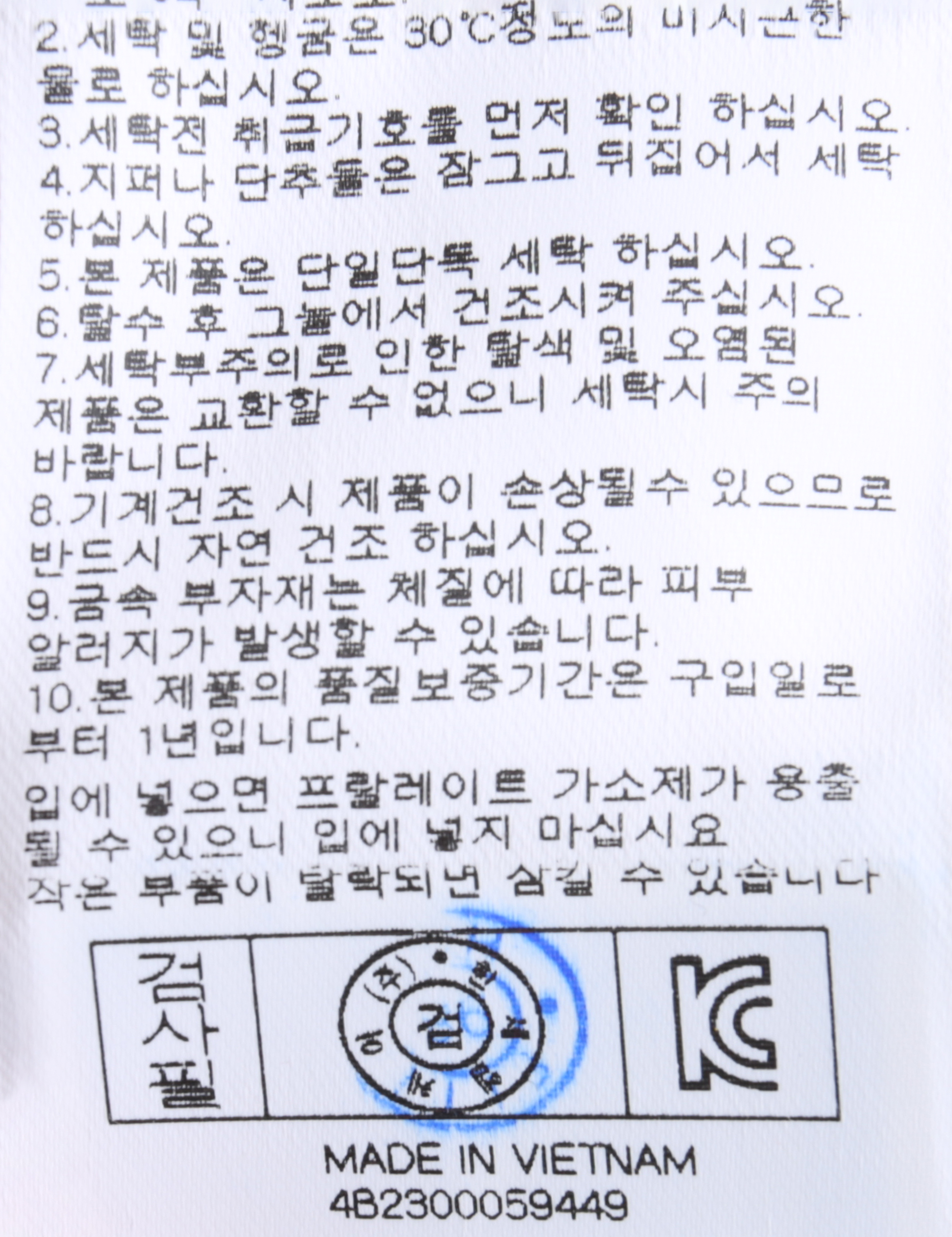 | 세탁방법 및 취급시 주의사항 | 중성세제로 단 시간내에 세탁하십시오.(케어라벨참고) |