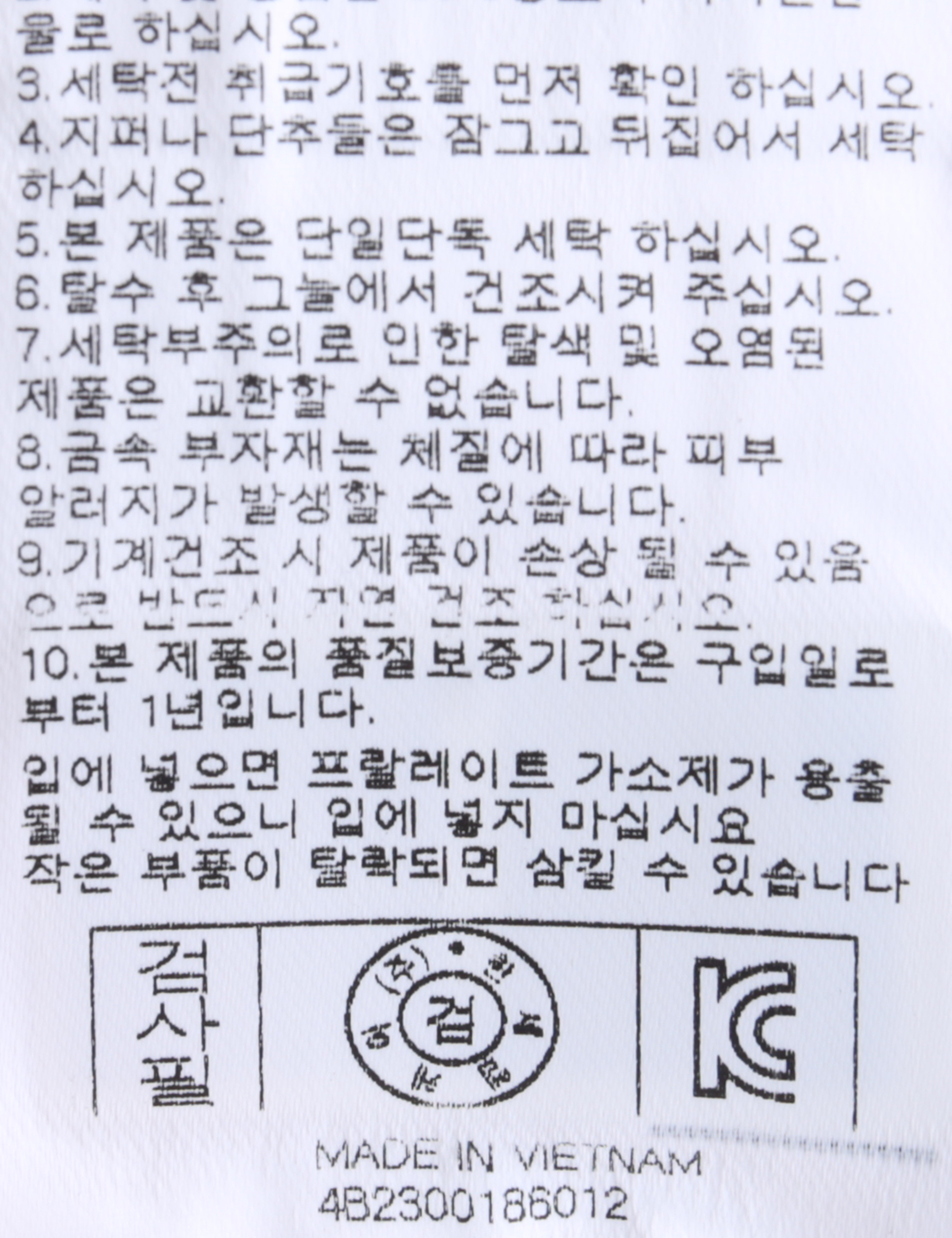 | 세탁방법 및 취급시 주의사항 | 본 제품은 손세탁 하십시오.(케어라벨참고) |