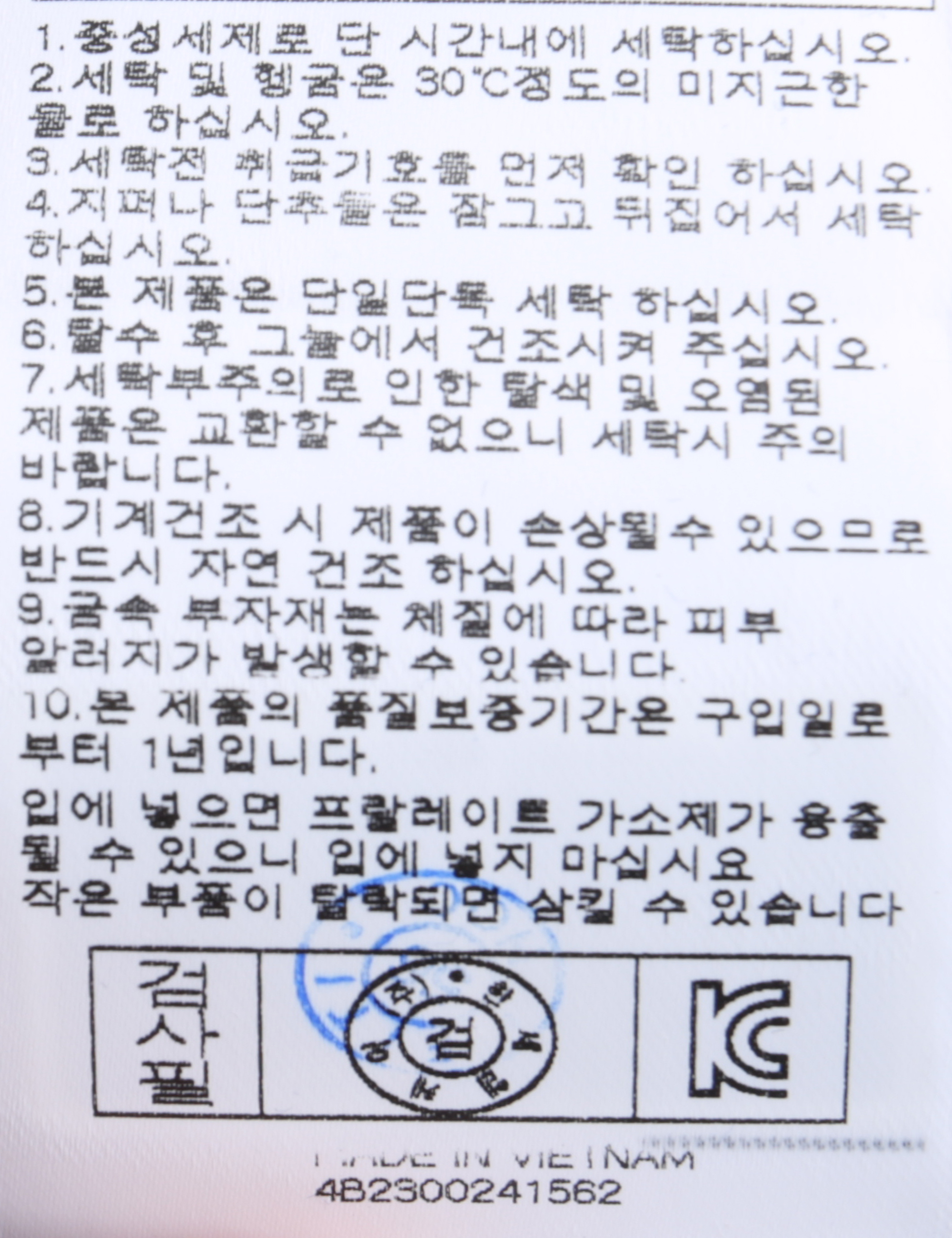 | 세탁방법 및 취급시 주의사항 | 중성세제로 단 시간내에 세탁하십시오.(케어라벨참고) |