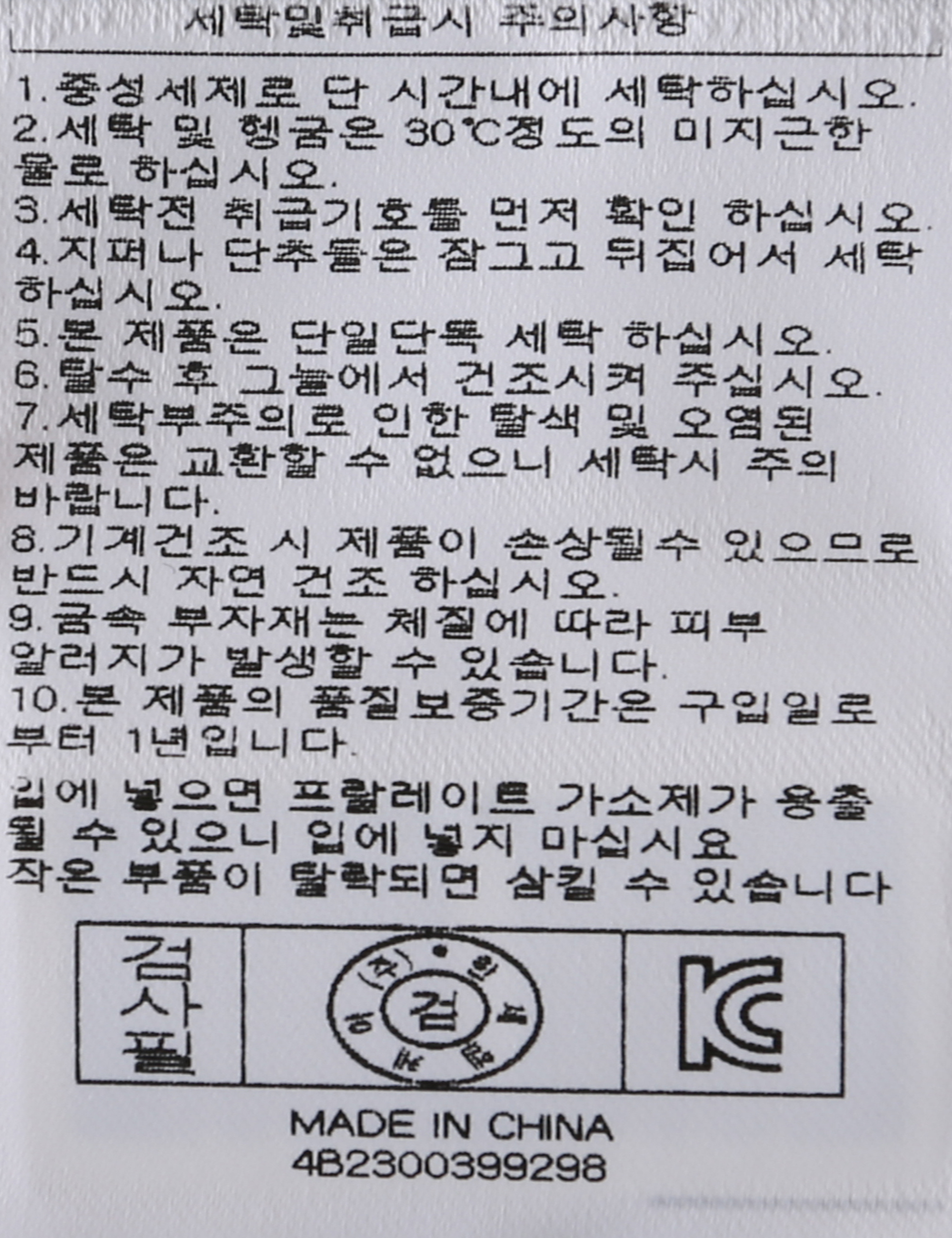 | 세탁방법 및 취급시 주의사항 | 중성세제로 단 시간내에 세탁하십시오.(케어라벨참고) |