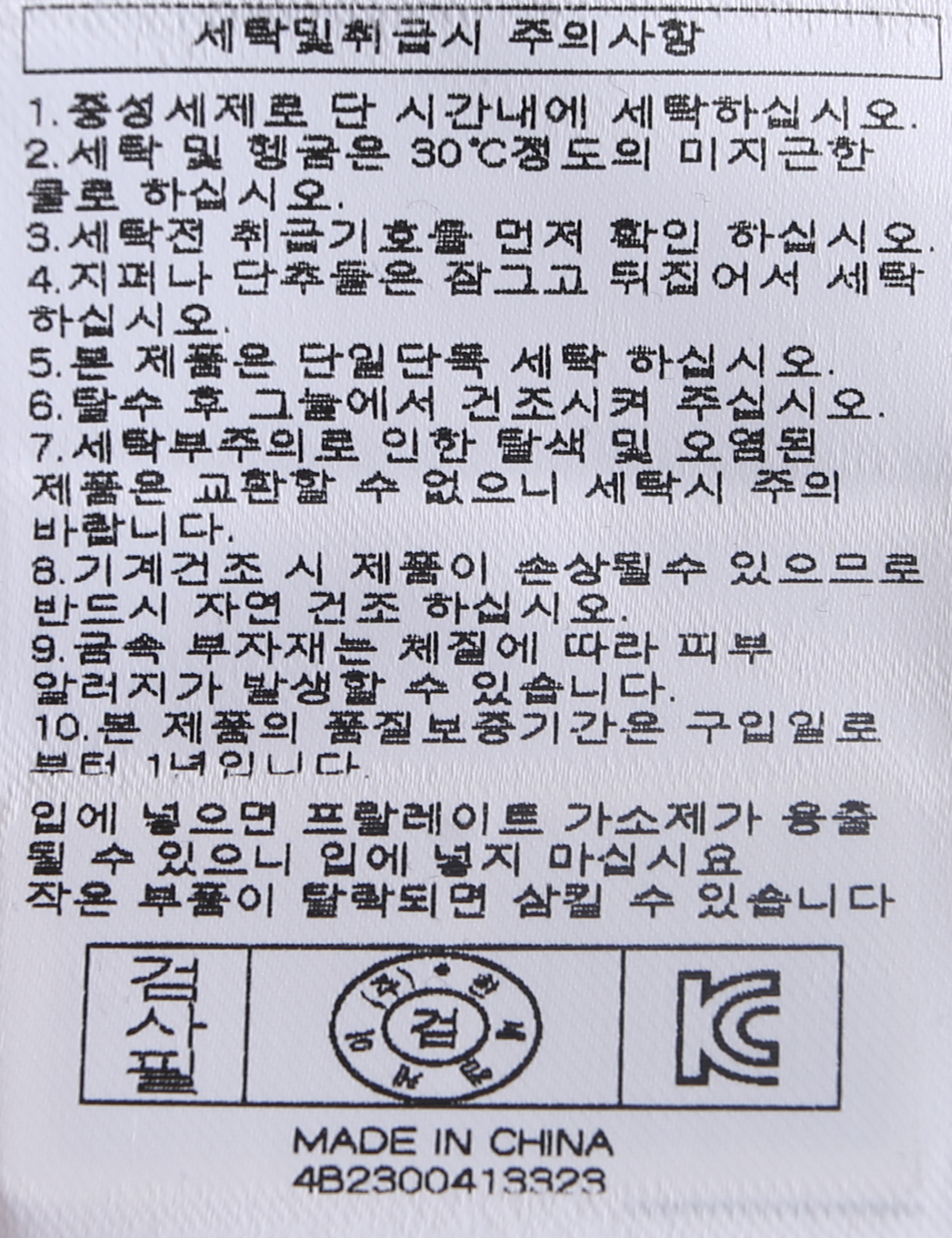 | 세탁방법 및 취급시 주의사항 | 중성세제로 단 시간내에 세탁하십시오.(케어라벨참고) |