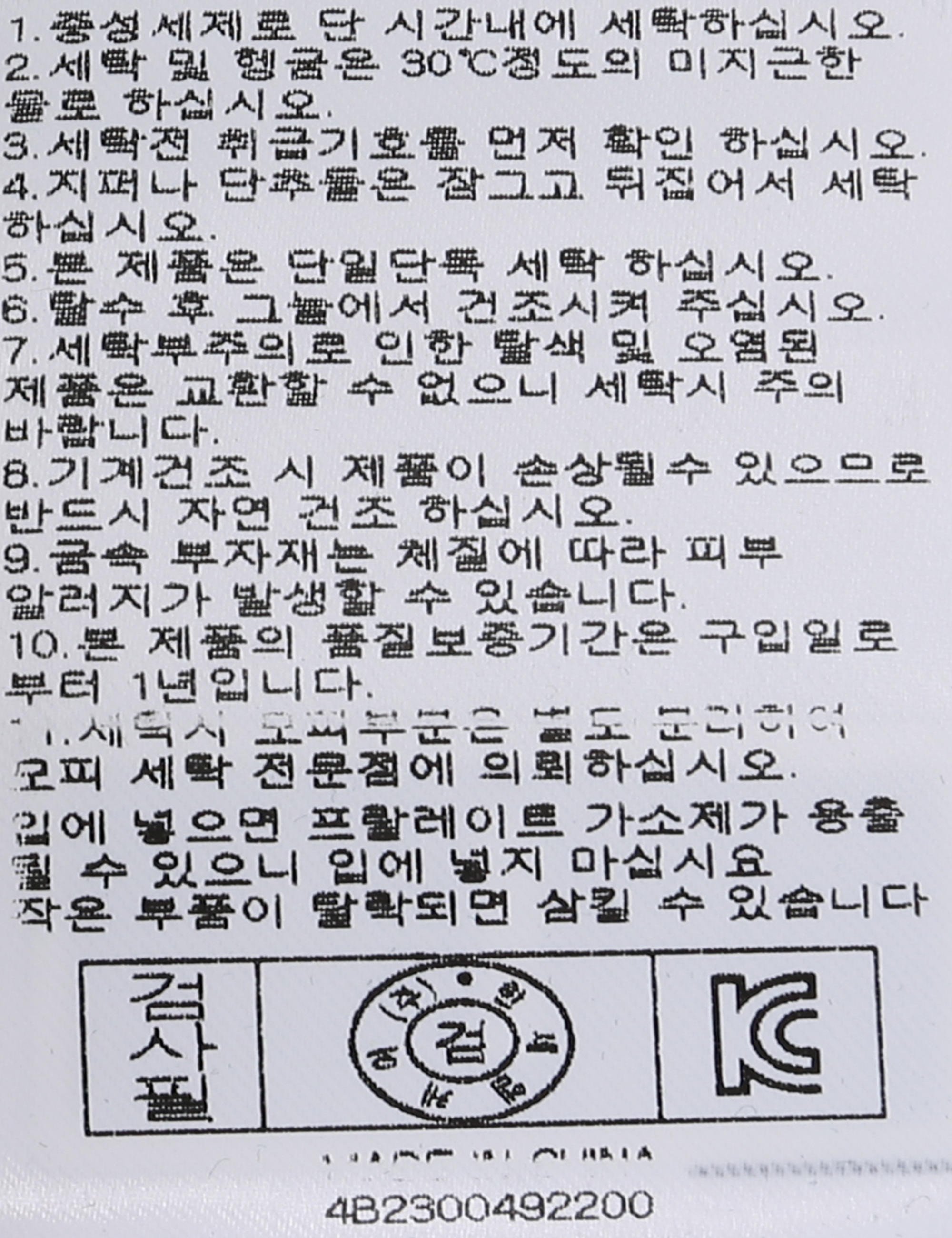| 세탁방법 및 취급시 주의사항 | 중성세제로 단 시간내에 세탁하십시오.(케어라벨참고) |