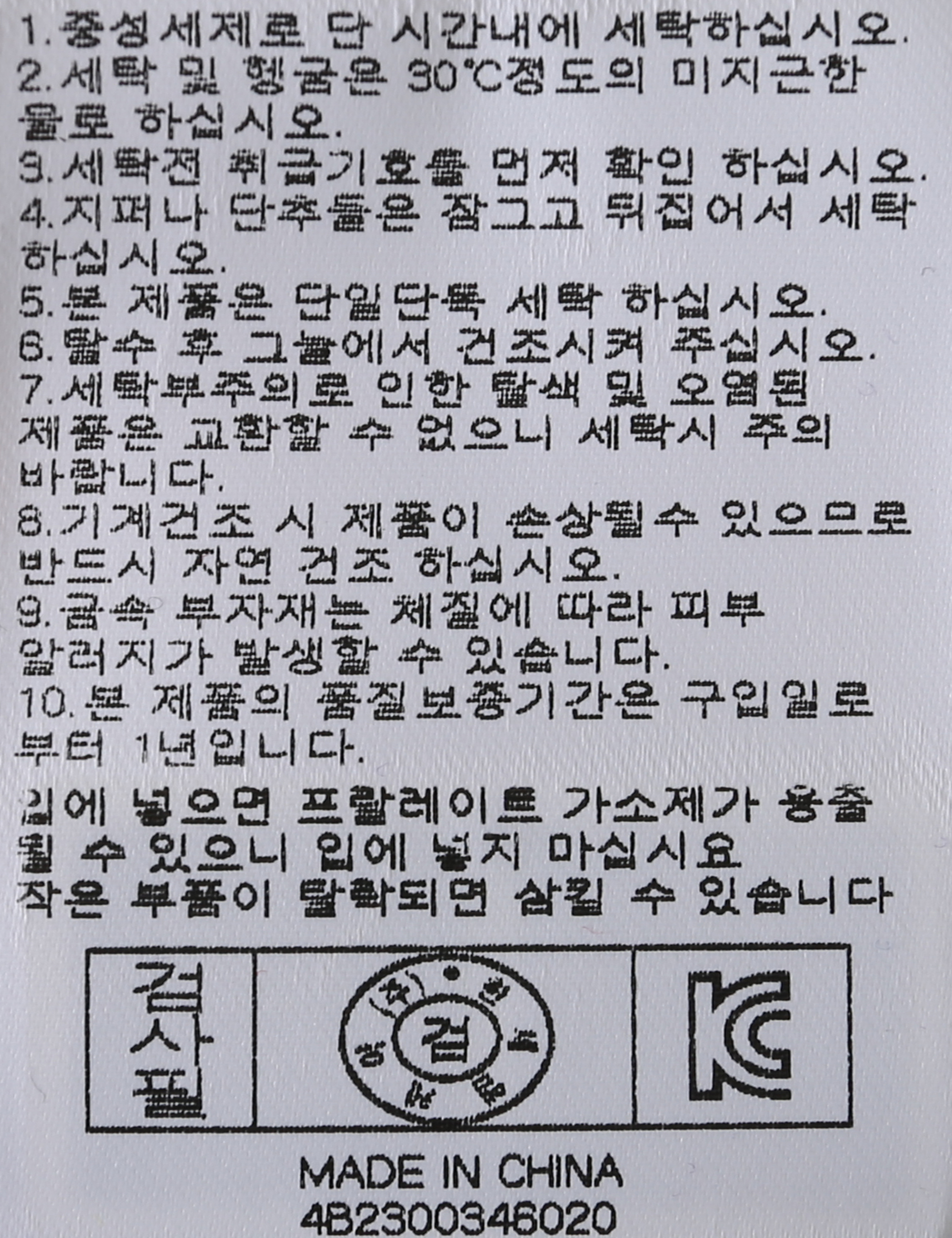 | 세탁방법 및 취급시 주의사항 | 중성세제로 단 시간내에 세탁하십시오.(케어라벨참고) |