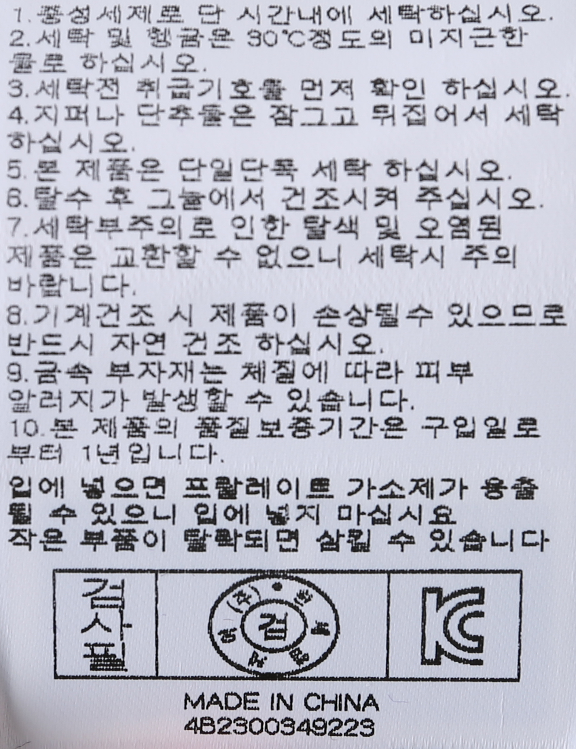 | 세탁방법 및 취급시 주의사항 | 중성세제로 단 시간내에 세탁하십시오.(케어라벨참고) |