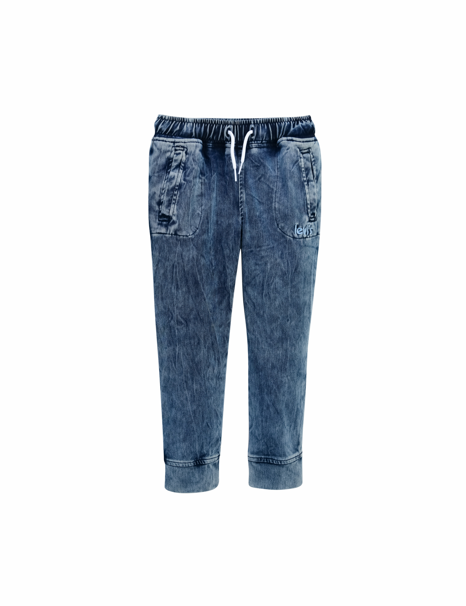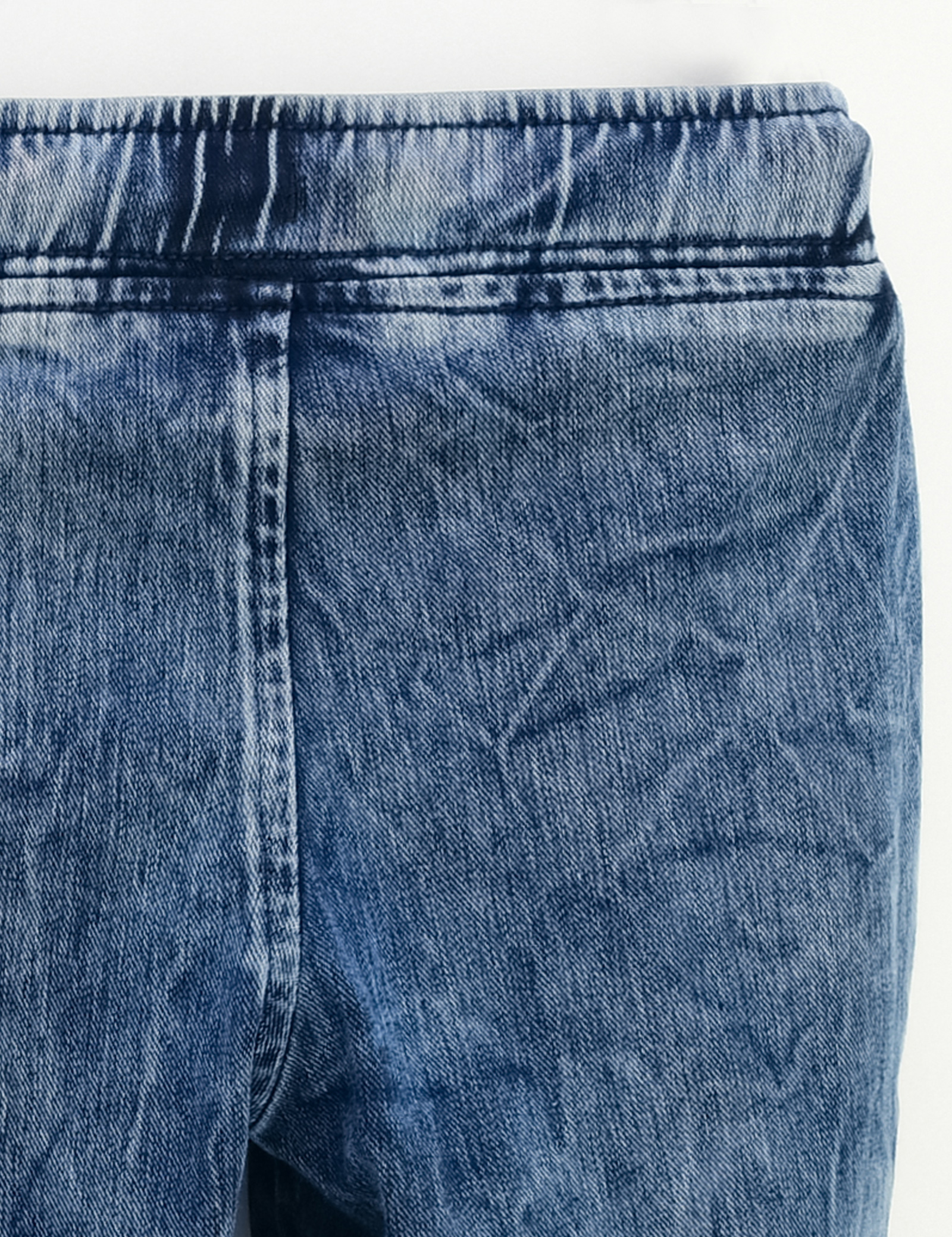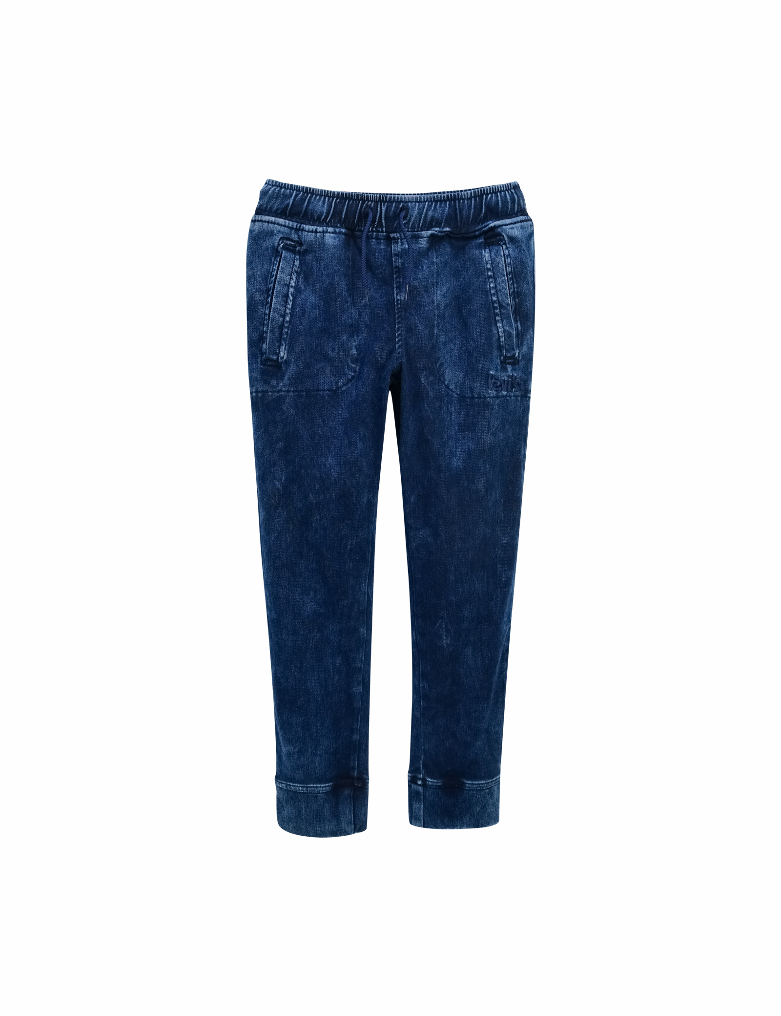 허리에 조절끈이 있으며, 부드럽고신축성있는 니트 데님 소재를 사용한 조거 팬츠