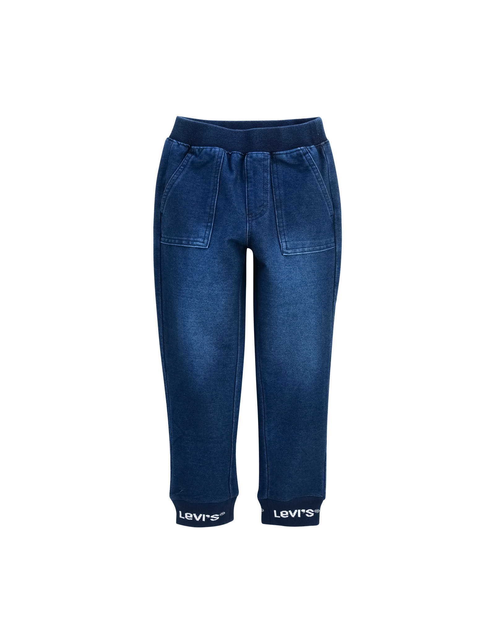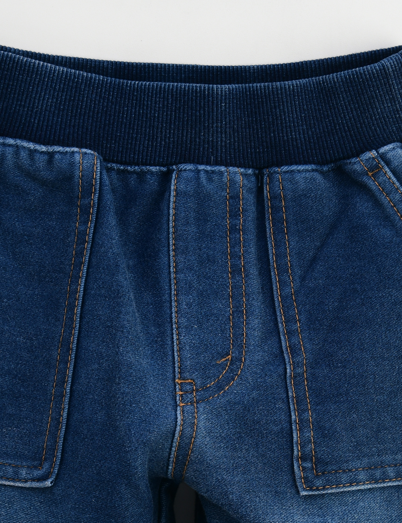 허리와 발목에 밴딩처리 되어 있는프렌치테리 소재의 니트데님 조거