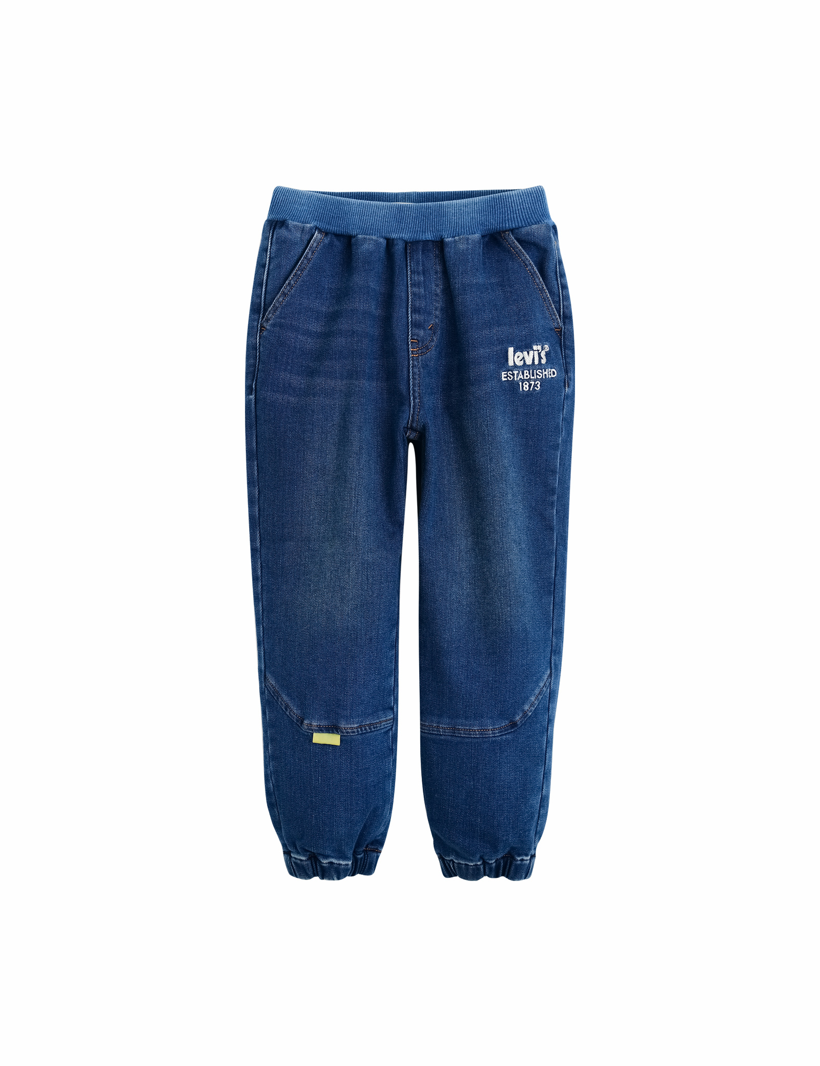 옐로우 탭이 포인트로 달려있으며,플리스 기모 안감으로 보온성을 높인 신축성 있고 부드러운 풀온 데님 조거