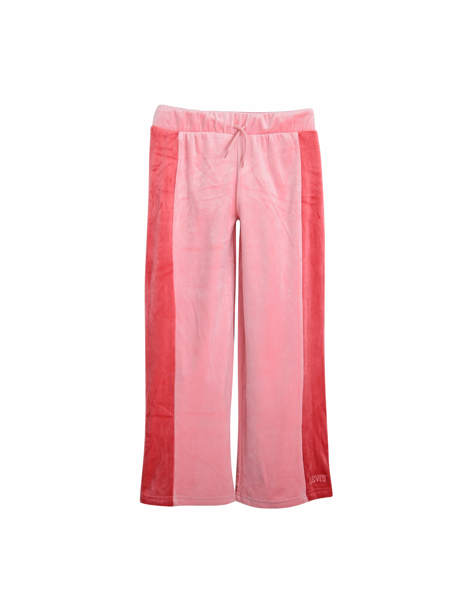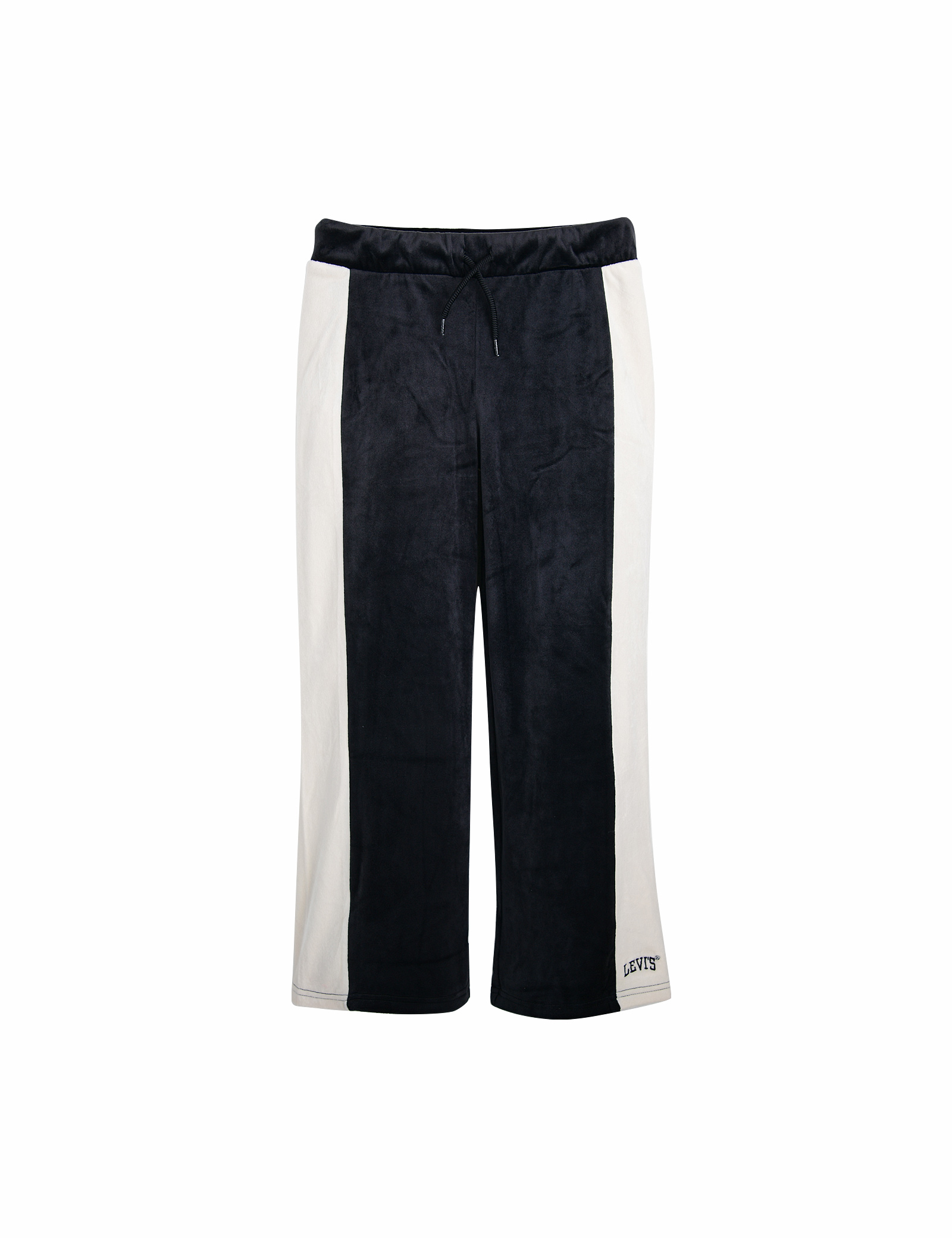 옆면에 칼라블록이 들어가 있으며,밑단이 넓어지는 와이드 핏의 벨벳팬츠
