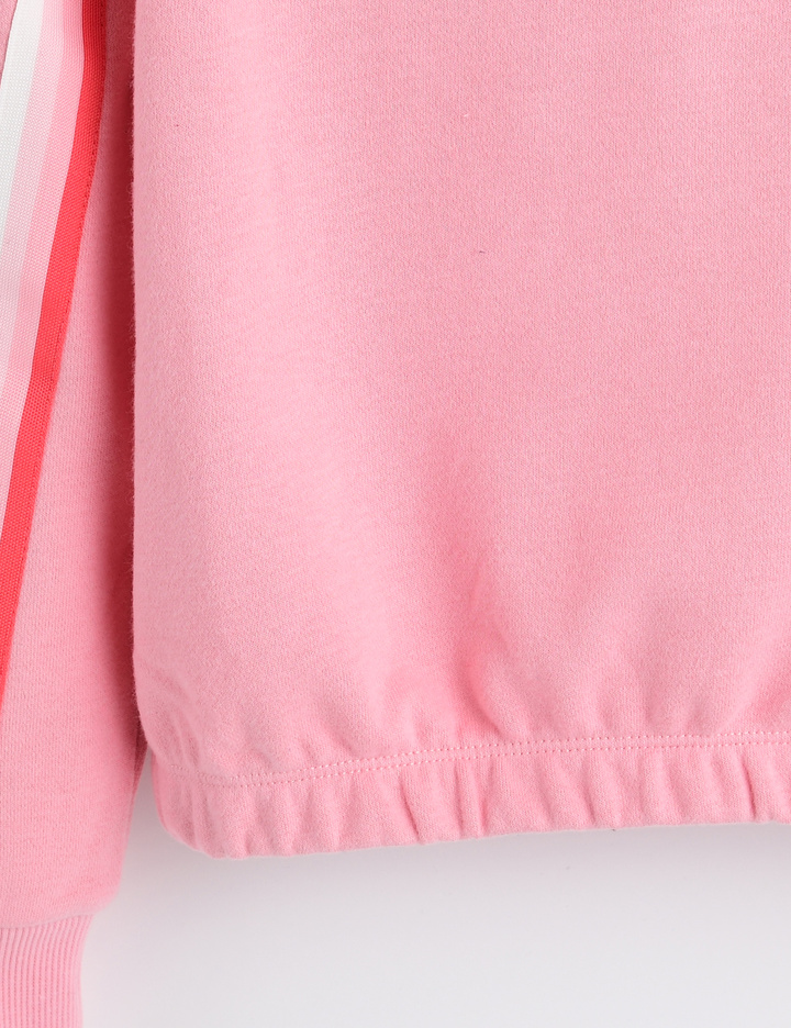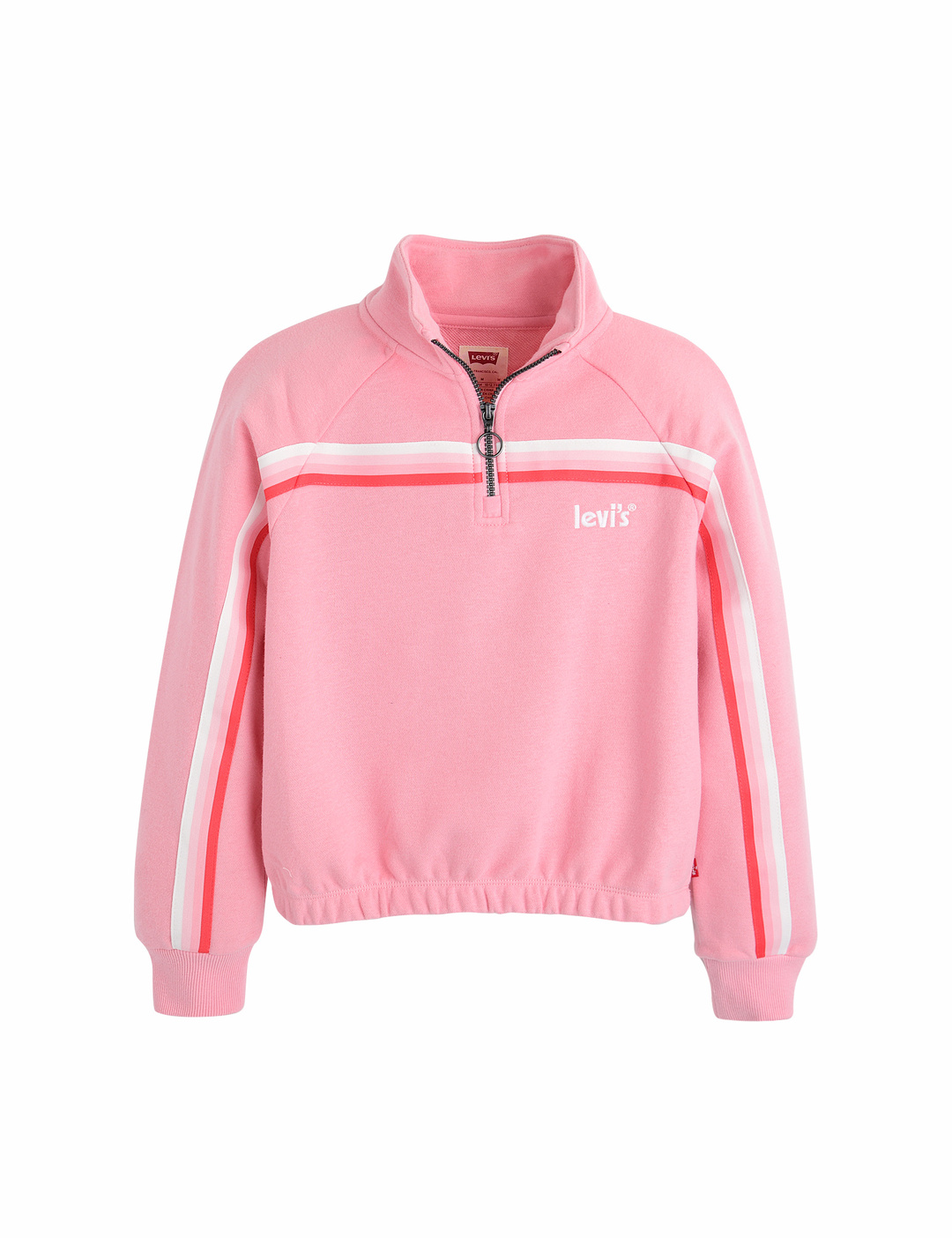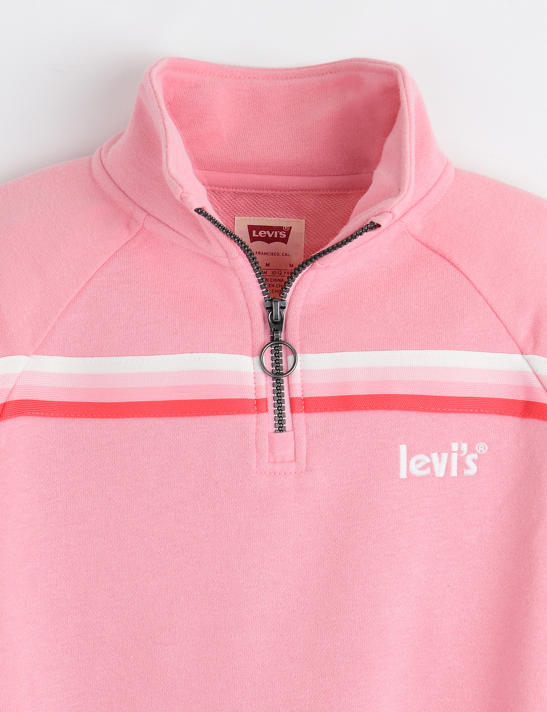 가슴과 소매에 가로로 스트라이프 테이핑이 포인트로 들어가 있는 반집업 스타일의 프렌치테리 풀오버