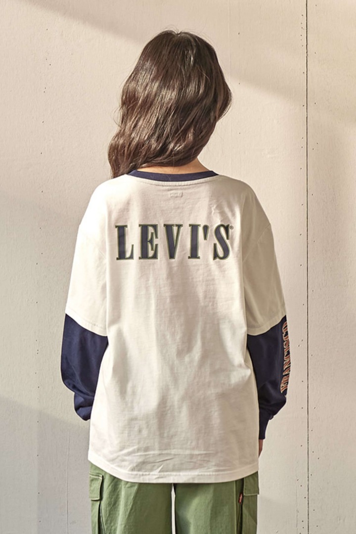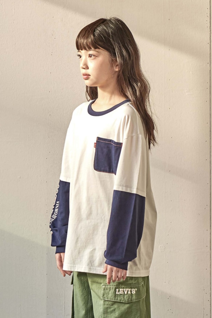 레이어드 스타일을 연출한 2FER 구조의 롱슬리브 티셔츠 배색 슬리브 디테일이 캐주얼한 포인트를 더함 단독 착용만으로 코디 완성도가 높아지는 디자인 데님 팬츠 조거 팬츠와 매치하기 쉬운 아이템