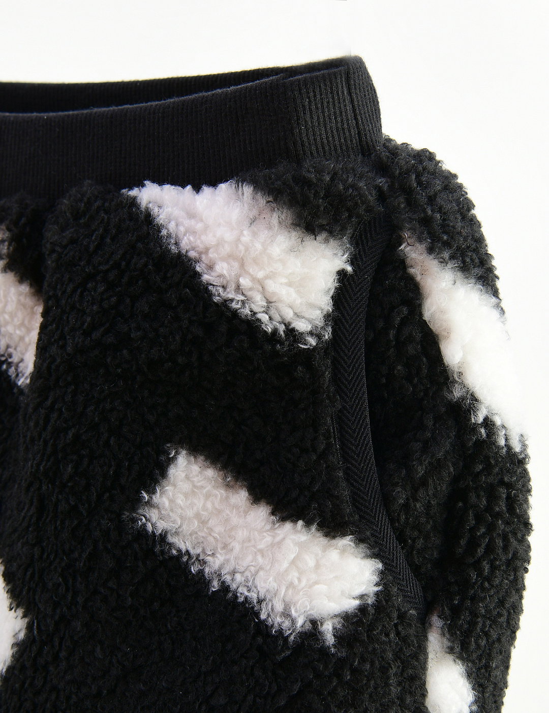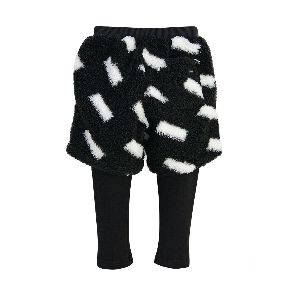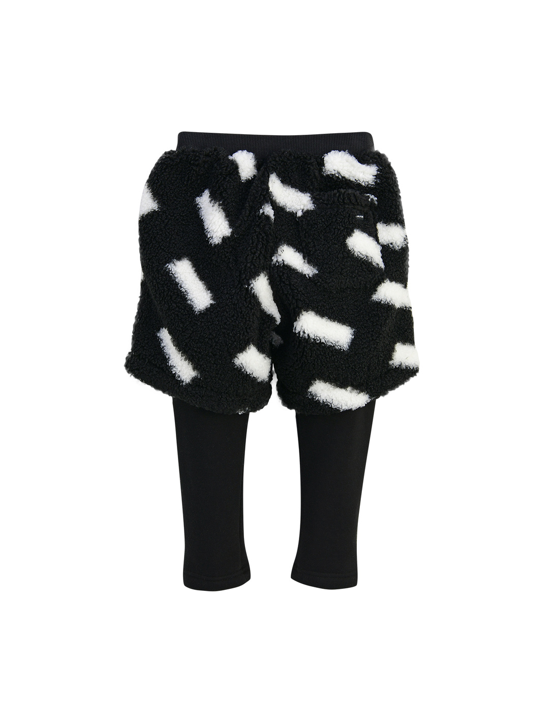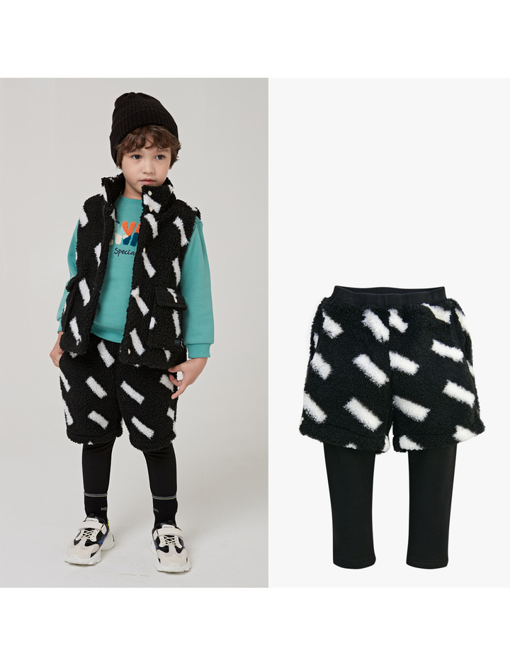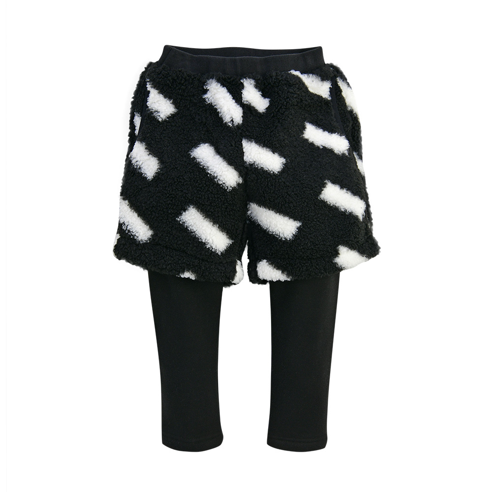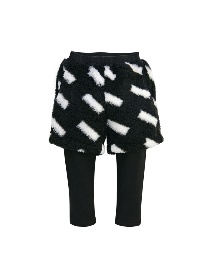 덤블 바지에 도톰한 키모 원단 레깅스 바지를 더해 레이어드하여 입은듯한 느낌의 한 벌 배색 팬츠입니다. 귀여운 느낌의 사각 패턴 원단을 사용하여 고급스러우면서도 유니크한 느낌을 주는 상품입니다.