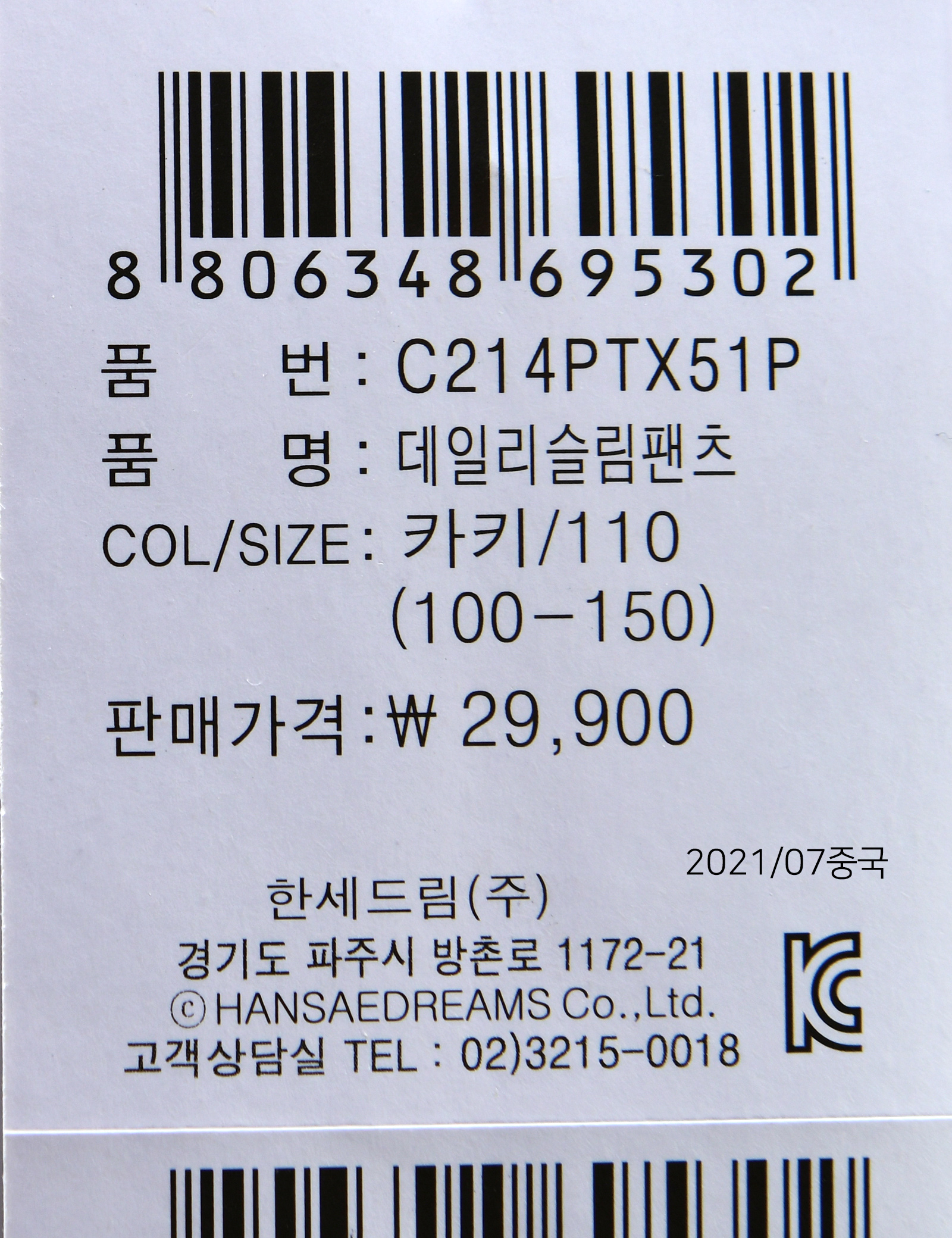 상품명 [컬리수] 데일리슬림팬츠