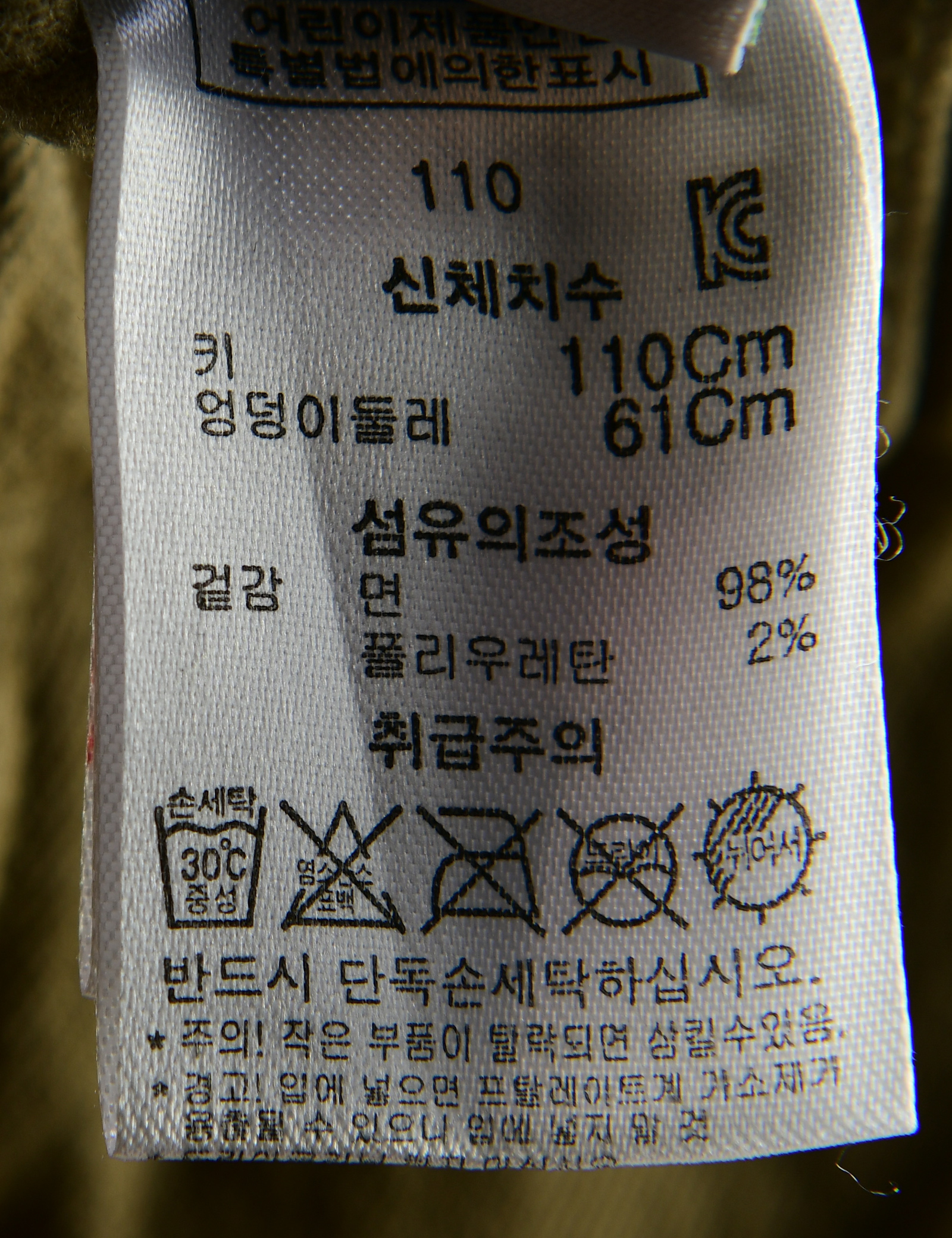 제품소재 (겉감)면98%,폴리우레탄2%