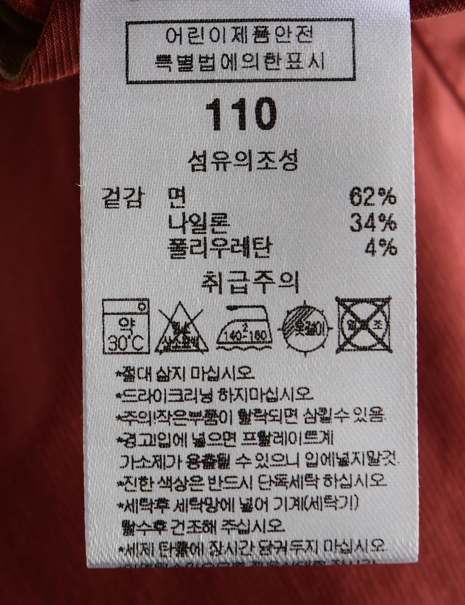 제품소재 (겉감)면62%,나일론34%,폴리우레탄4%