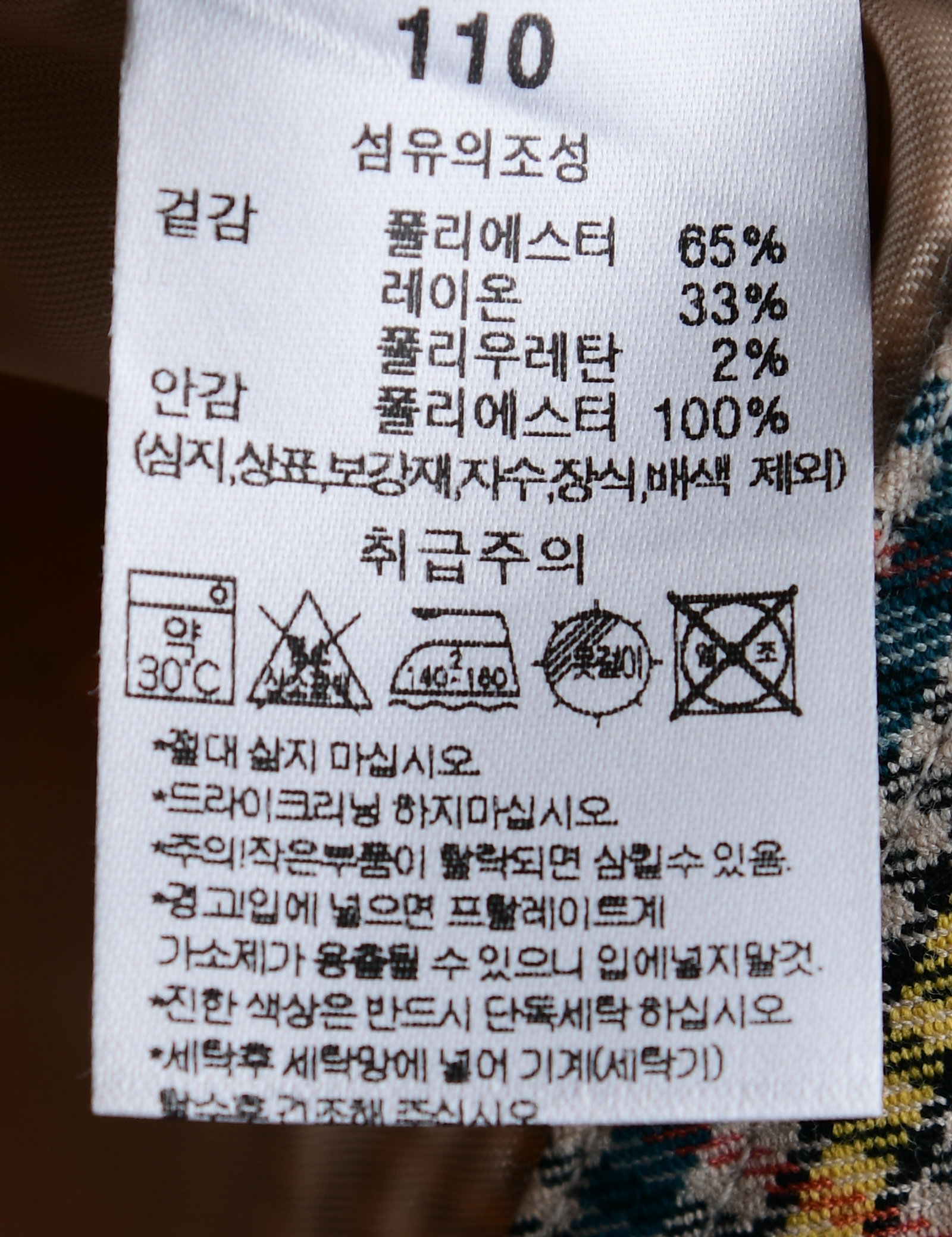 제품소재 (겉감)폴리에스터65%,레이온33%,폴리우레탄2%(안감)폴리에스터100%