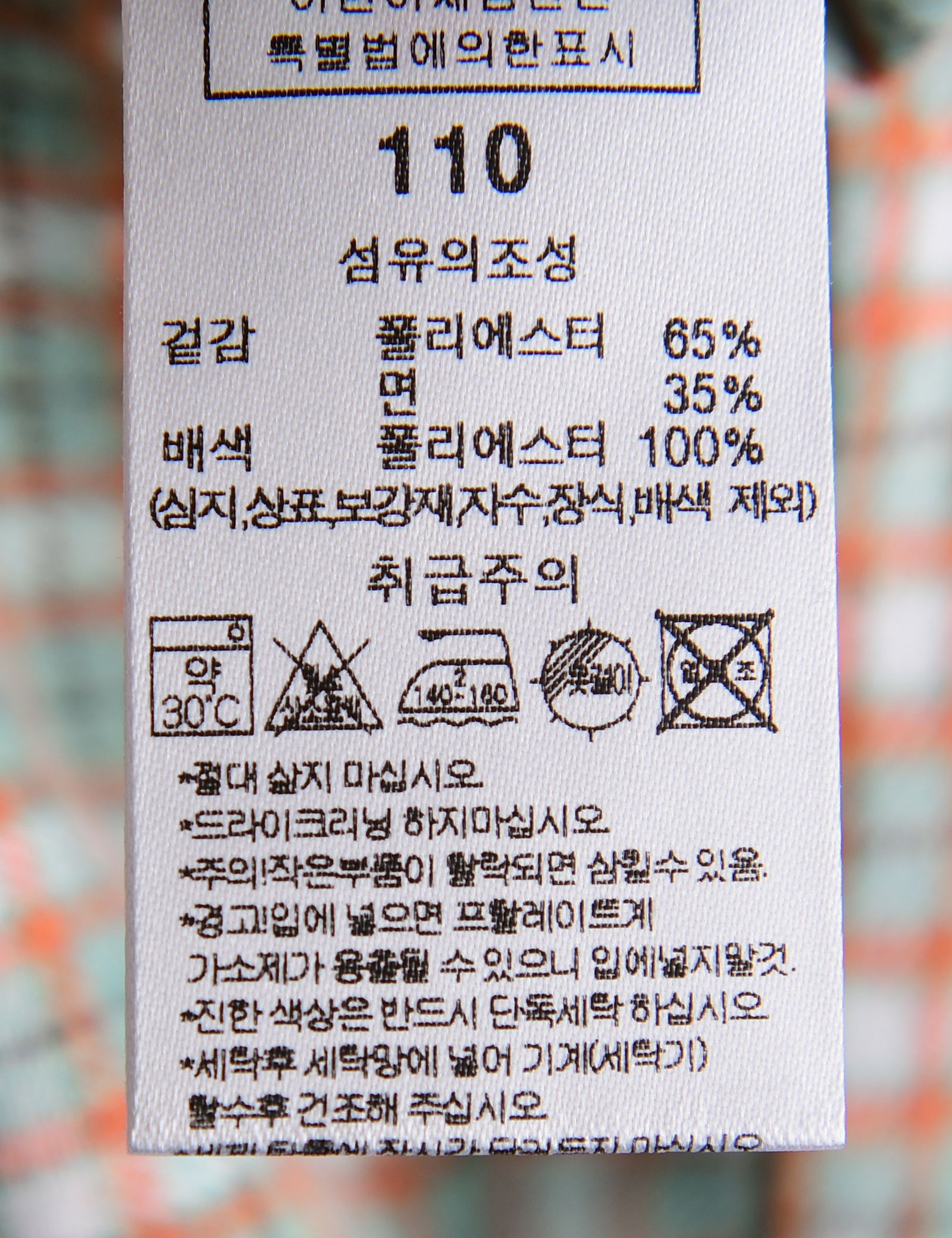 제품소재 (겉감)폴리에스터65%,면35%(배색)폴리에스터100%