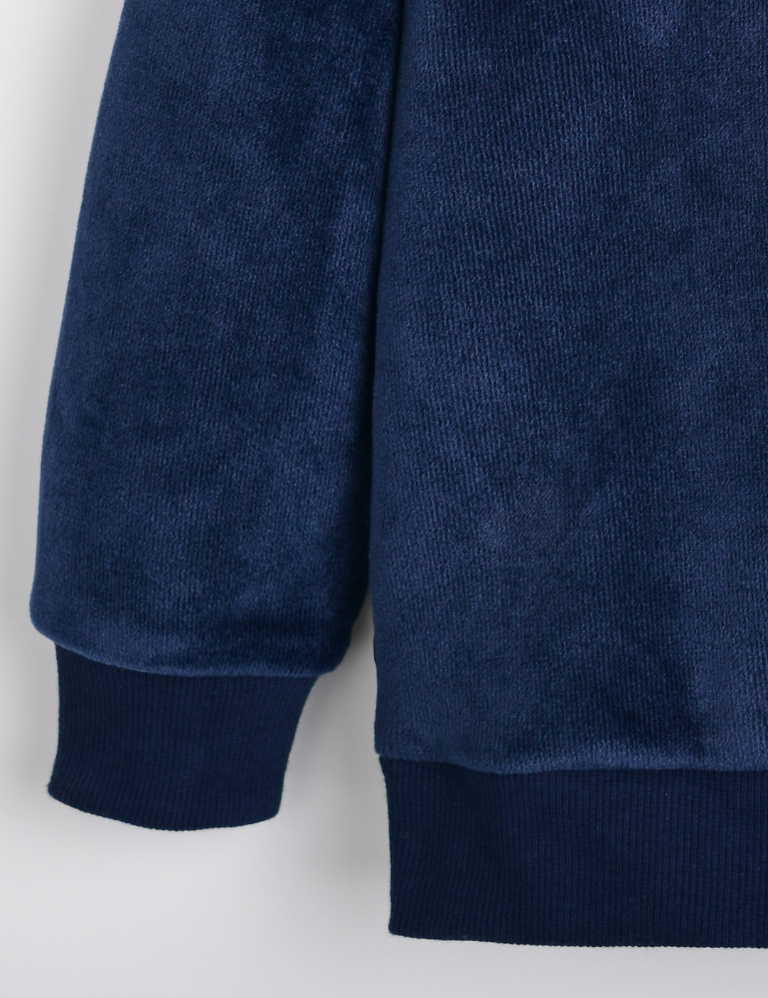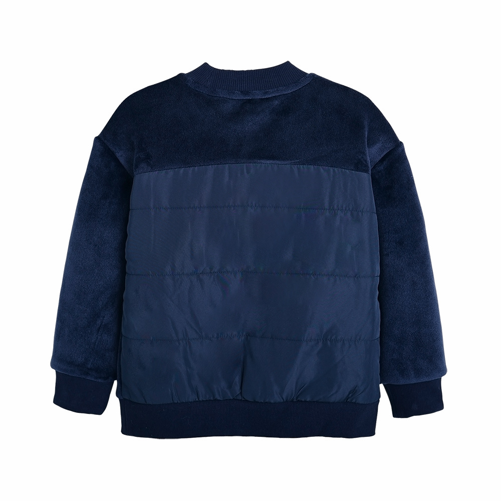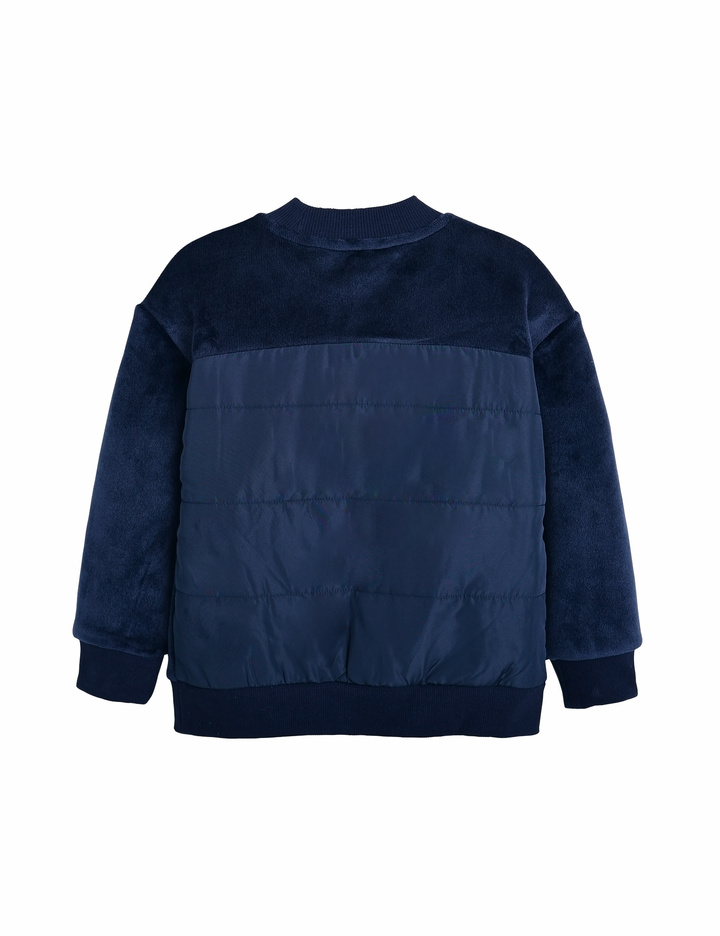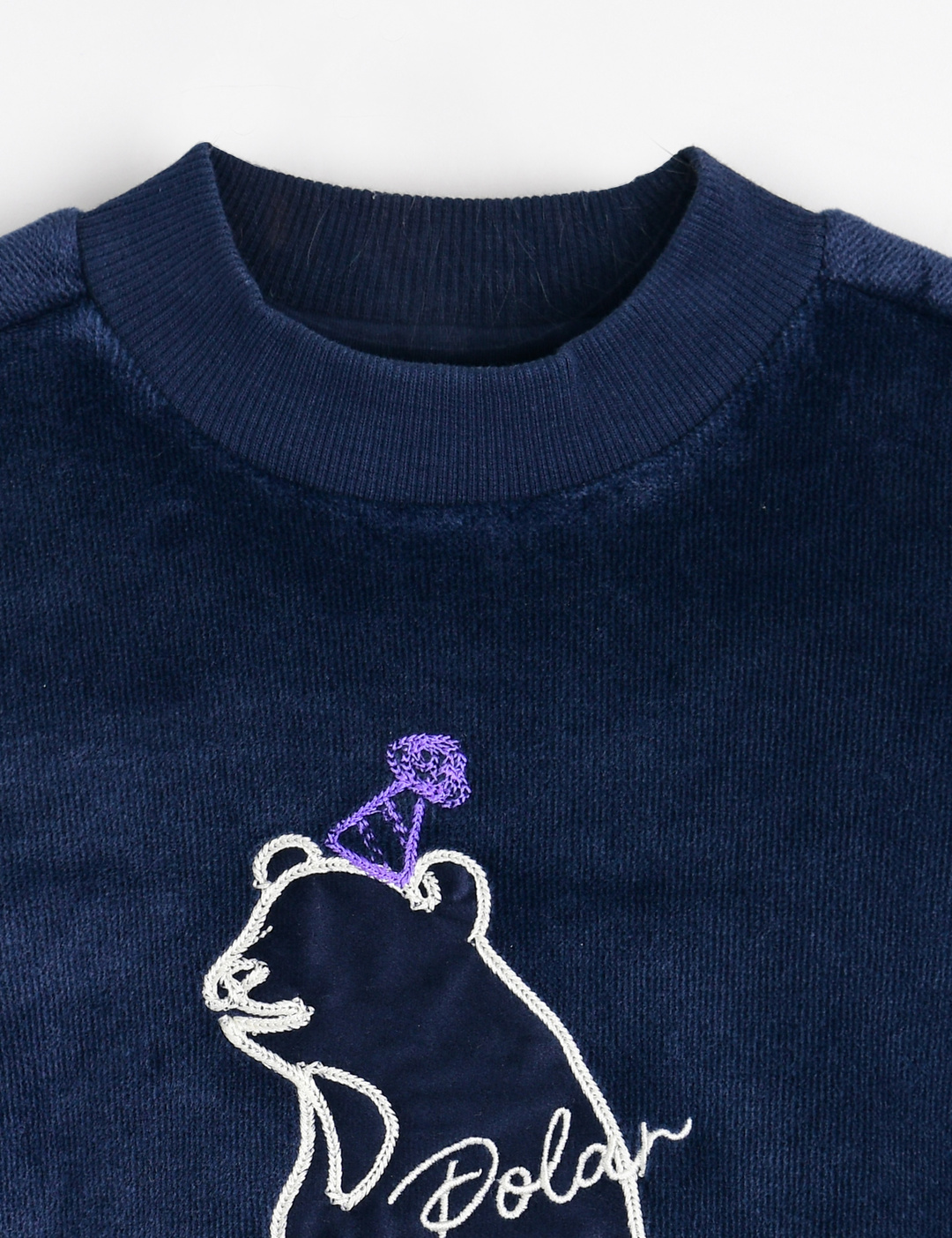 부드럽고 따뜻한 밍크시어링 소재의 맨투맨입니다. 뒤에는 패딩을 믹스하여 위트를 더하였고, 중앙에 벨로아 패치자수로 완성도를 높였습니다.