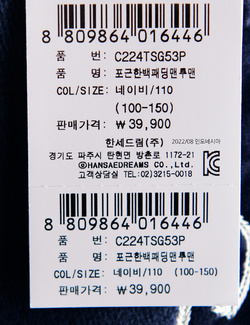 | 세탁방법 및 취급시 주의사항 | 본 세품은 손세탁 하십시오(케어라벨 참고) |