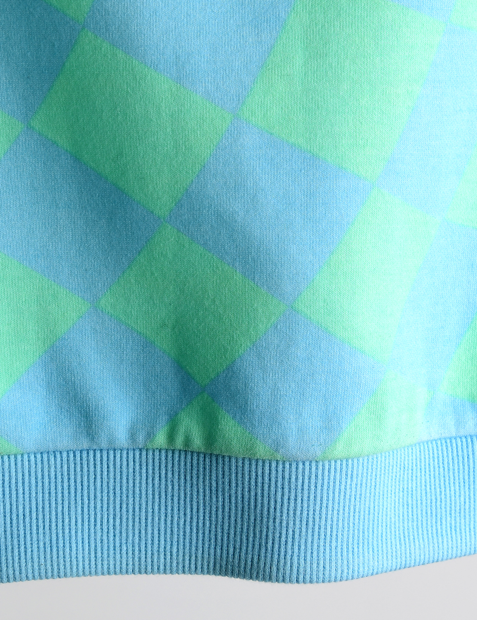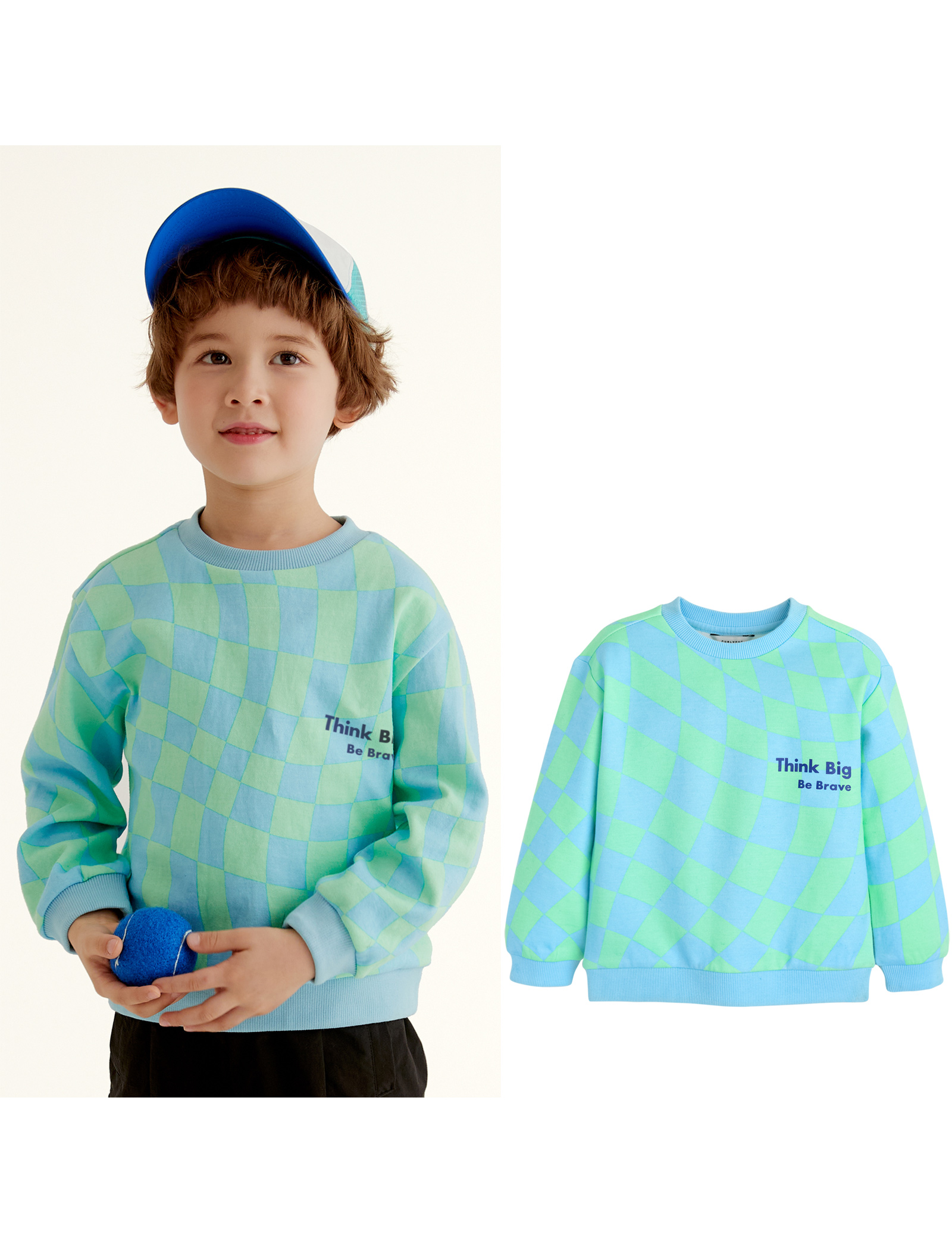 유니크한 느낌의 변형된 체커보드 패턴이 포인트인 맨투맨 티셔츠입니다. 봄이느껴지는 선명한 컬러의 패턴을 사용하여 맨투맨 하나만으로 화사한 느낌으로코디 연출하기 좋은 상품입니다.