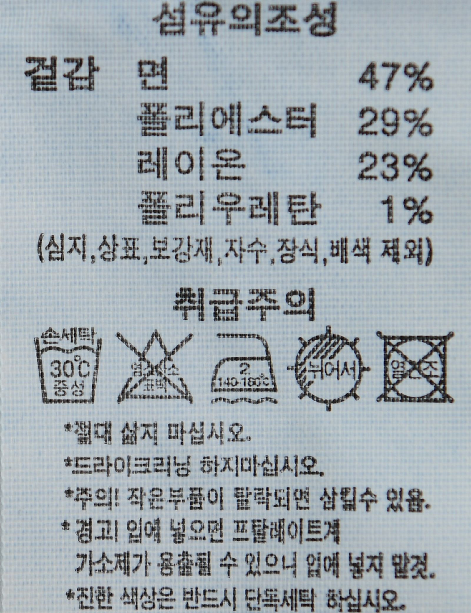 | 세탁방법 및 취급시 주의사항 | 본 세품은 손세탁 하십시오(케어라벨 참고) |