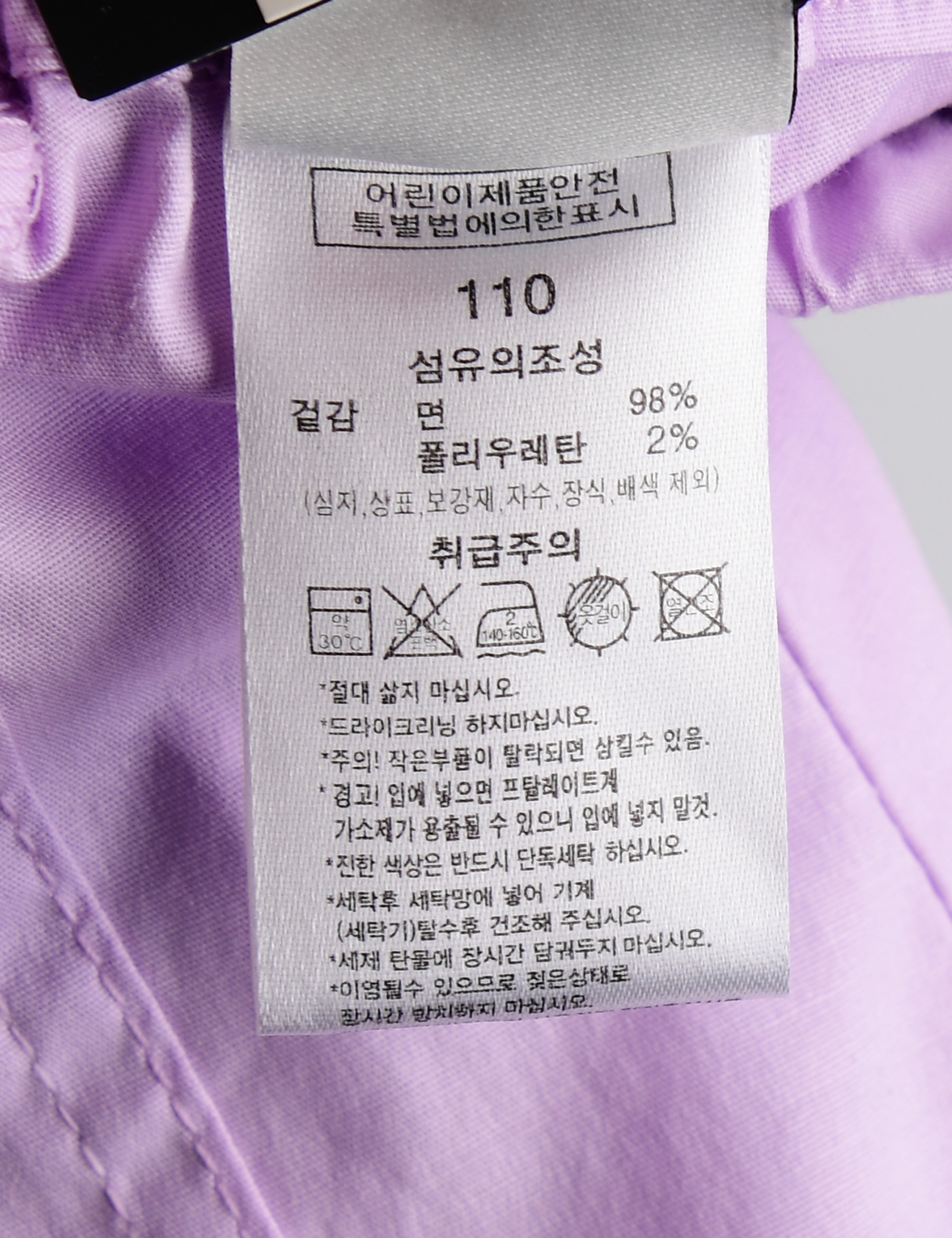 | 세탁방법 및 취급시 주의사항 | 본 세품은 손세탁 하십시오(케어라벨 참고) |