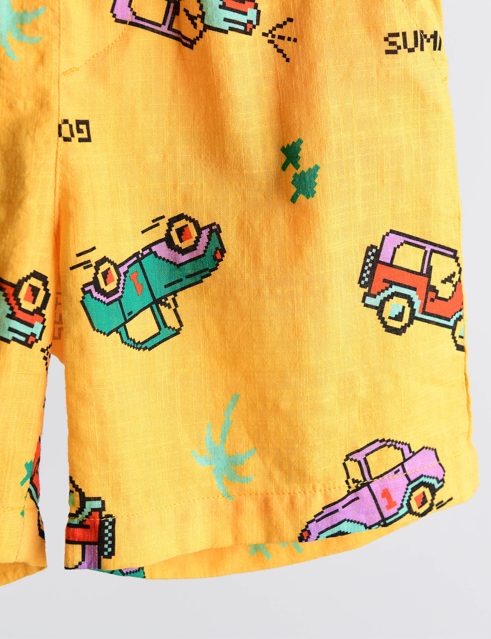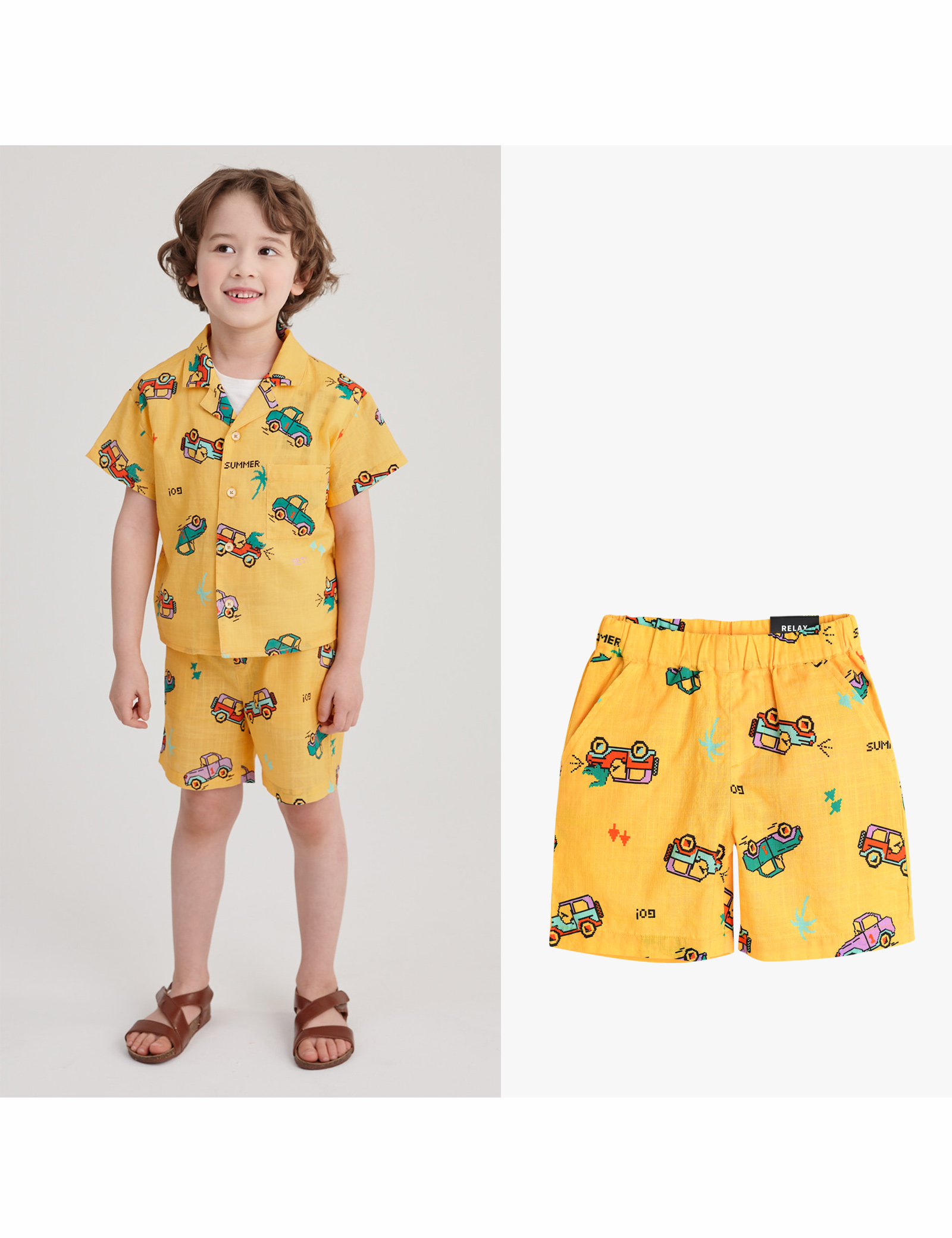 아이들이 좋아하는 자동차 모티브를 사용한 패턴 5부 팬츠입니다, 화사한 컬러감이 포인트인 제품으로 같은 패턴을 사용한 셔츠와 함께 코디하면 좋은 상품입니다.