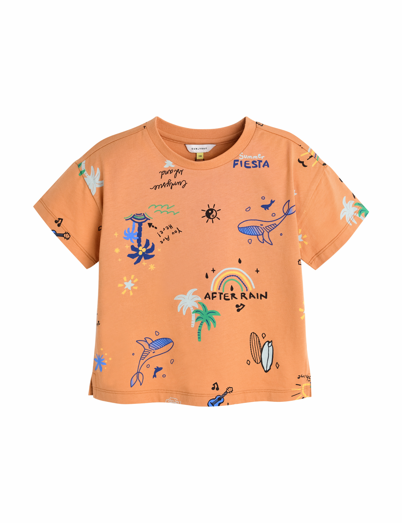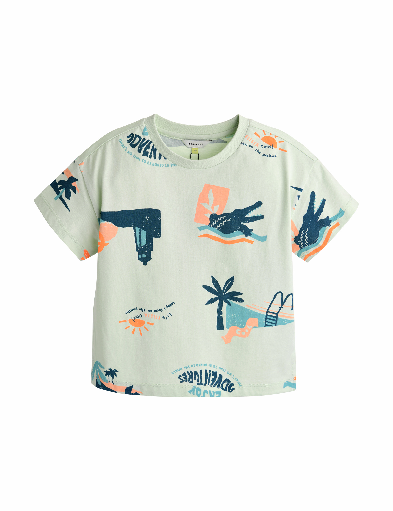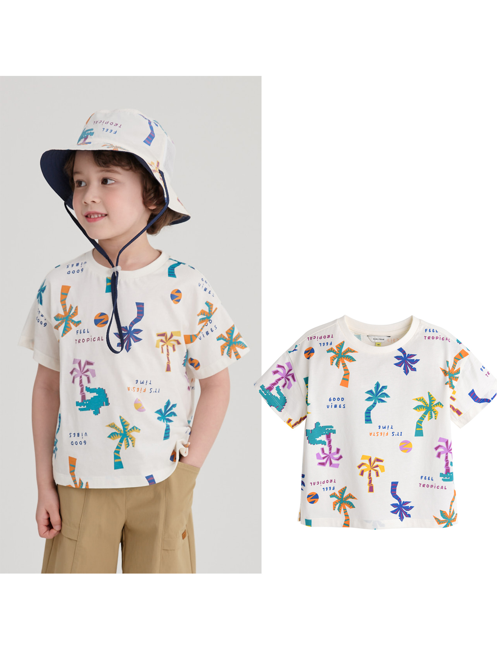 여름 시즌이 느껴지는 나염지가 포인트인 반팔 티셔츠입니다. 화사한 컬러감을사용한 나염지의 상품으로 티셔츠 하나만으로도 코디 포인트가 되는 제품입니다.