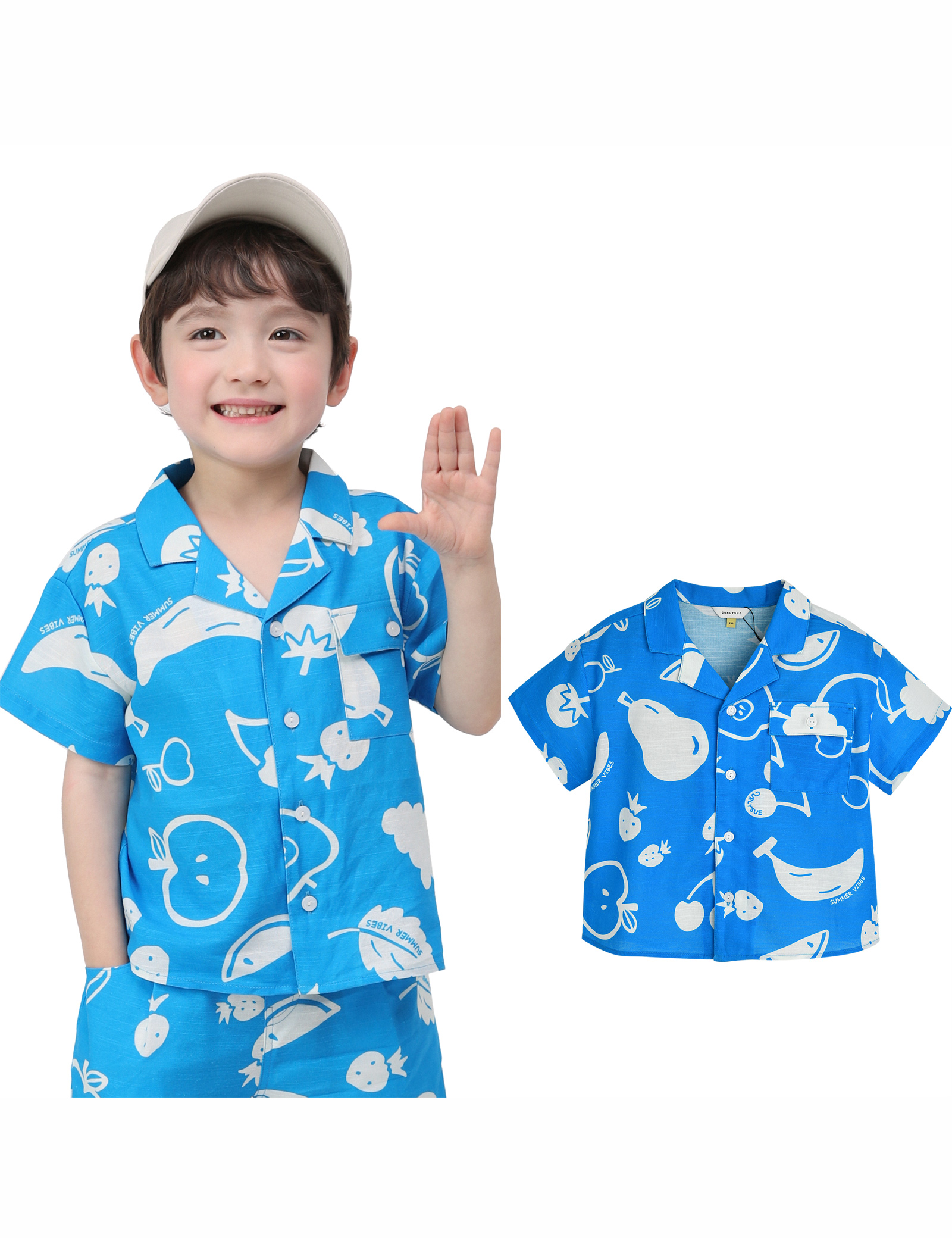 빅한 과일 모티프가 청량한 셔츠입니다.남아, 여아 모두에게 잘 어울리는 톡톡튀는 블루 컬러 패턴이 눈길을 사로잡는아이템입니다. 같은 패턴을 사용한 바지와 함께 코디하여 센스 있는 바캉스 룩을 연출해 주세요.