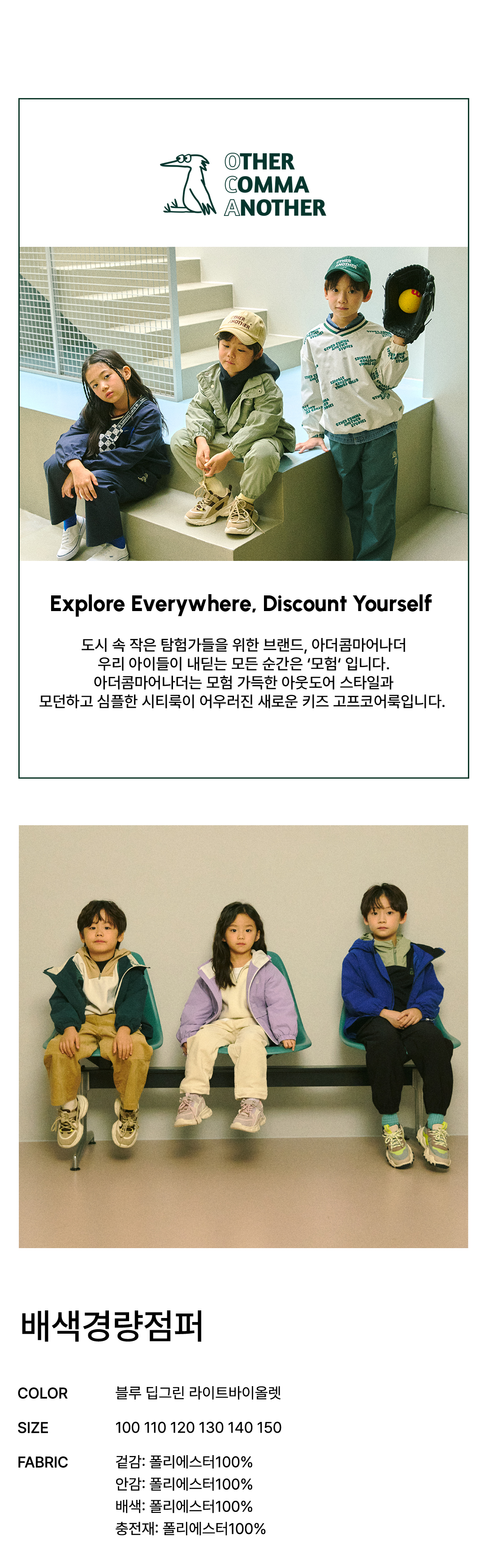 브랜드 홈 바로가기| 제품소재 | (겉감/안감/배색/충전재)폴리에스터100% |