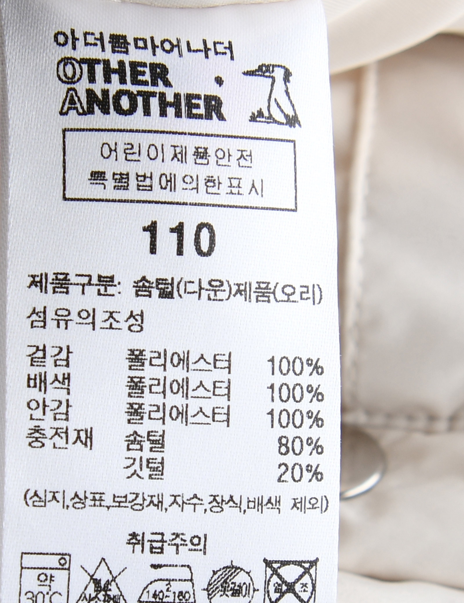브랜드 홈 바로가기| 제품소재 | (겉감/배색/안감)폴리에스터100%(충전재)솜털80%,깃털20% |